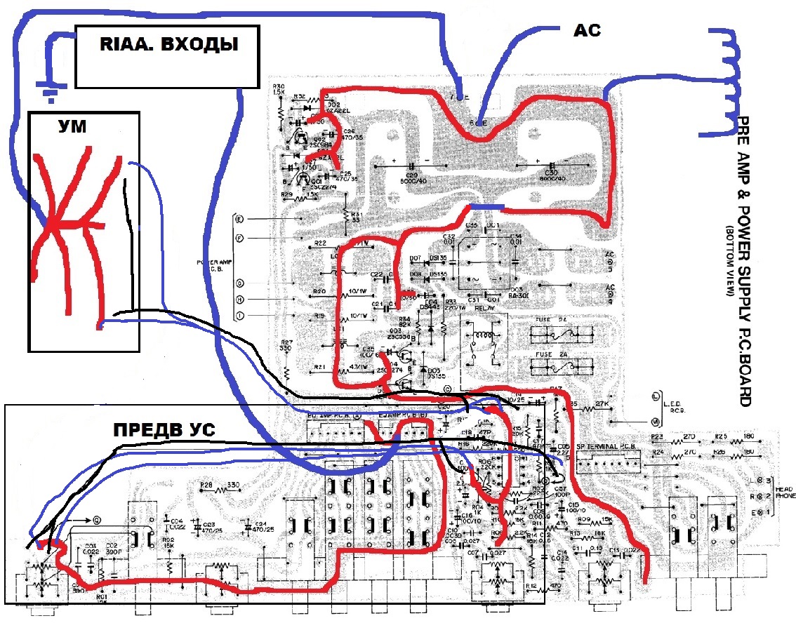 Все корпуса RCA, R03. C03 на корпус а C09 через R05 на силовую. Если оставить С09 с R05 на сигнальной, тогда силовая земля с шлейфа никуда не приходит (R11, 12 выкинуты после модернизации).