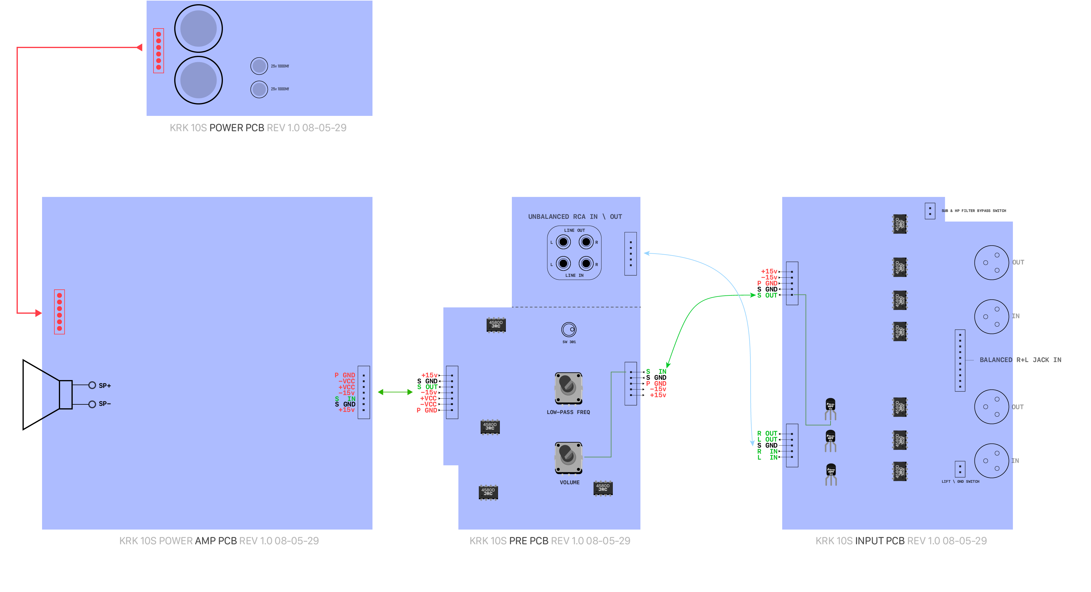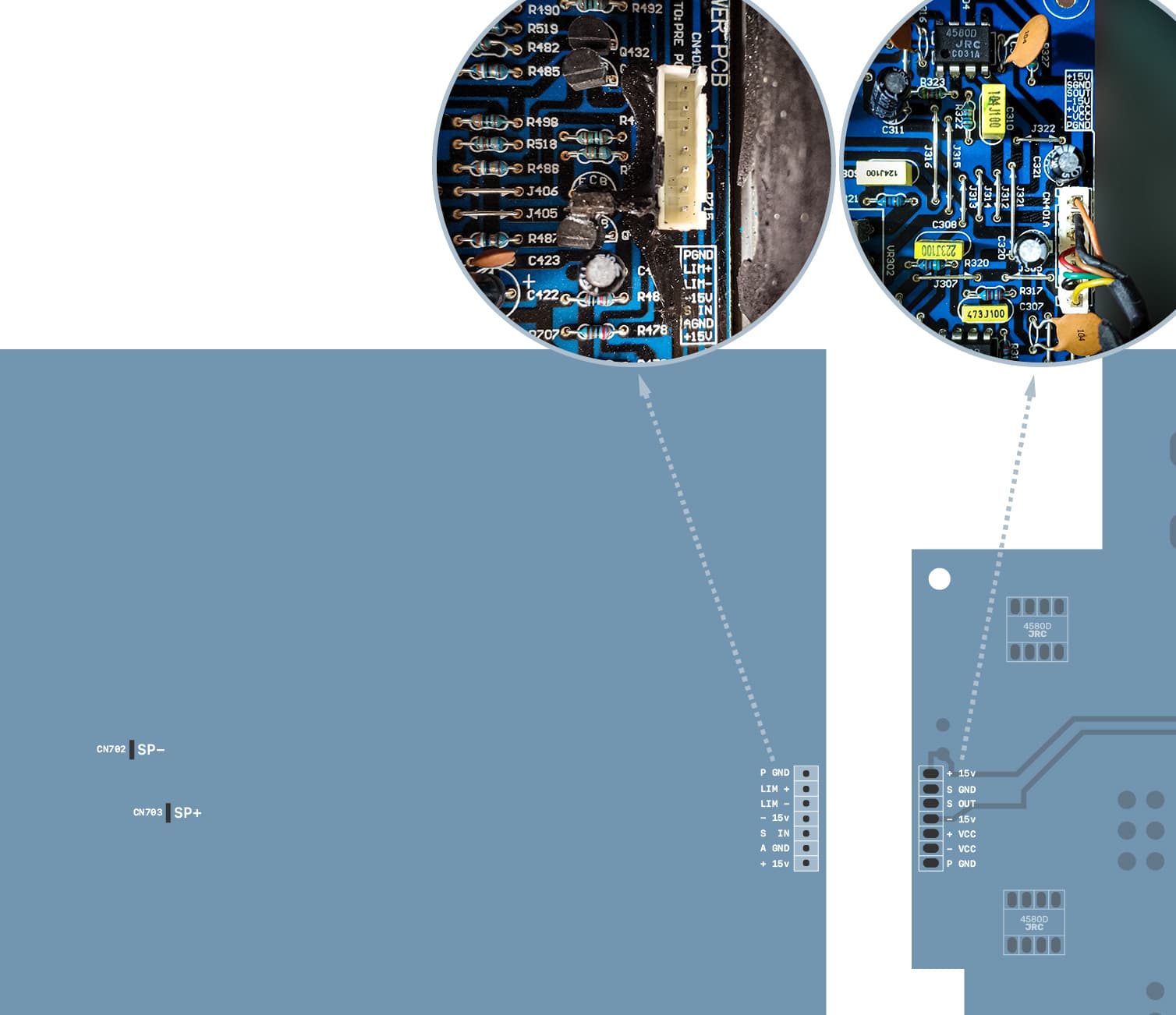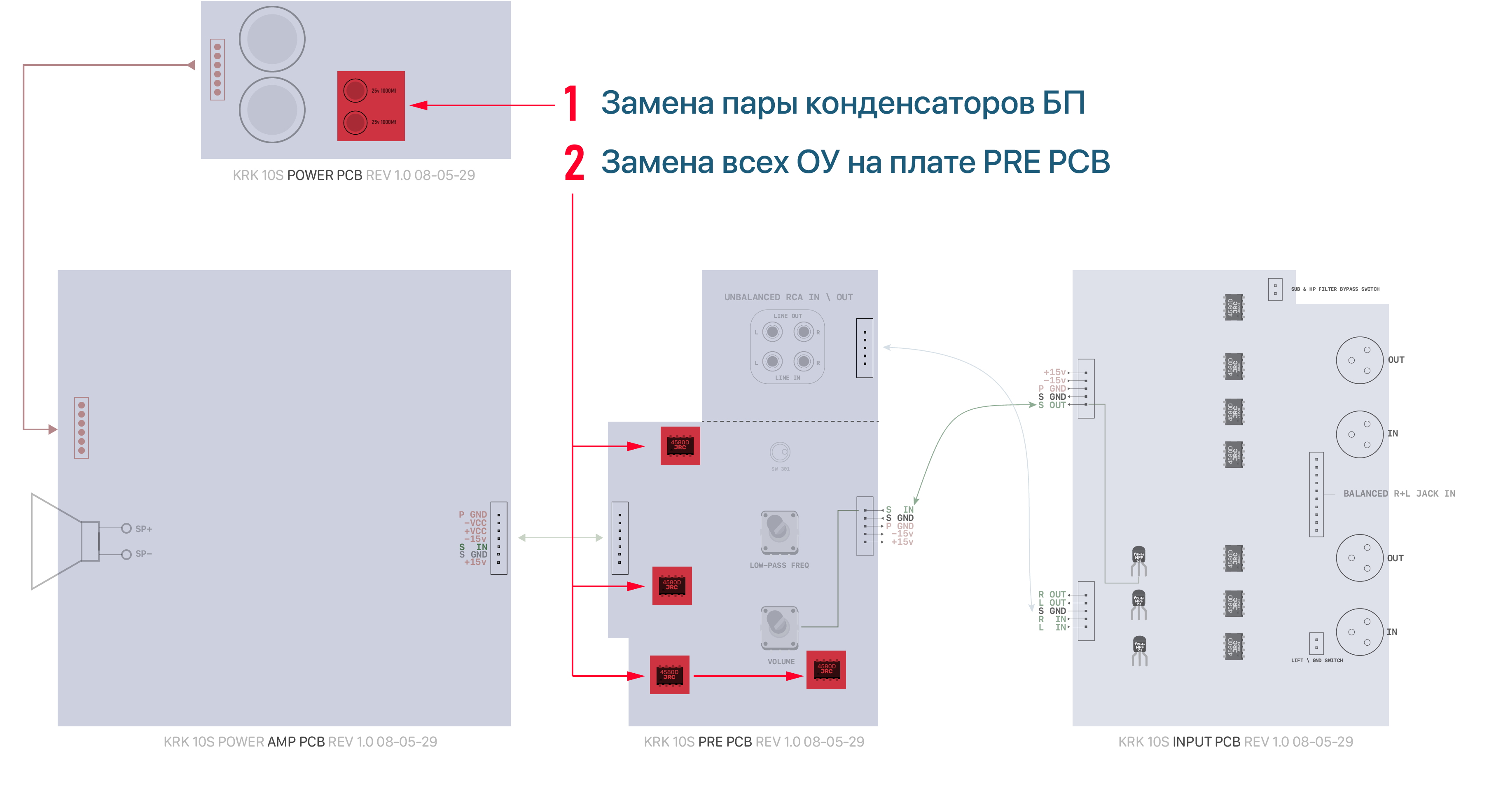 Дальше берём и рисуем\генерируем какимнть звуковым редактором "испытательный сигнал". Розовый шум какойнть. Непрерывный. Подаём его на вход "предварительной" платы, отключенной от УМа. А вход УМа используем в качестве "пробника" - тыкая им в разные места, можно услышать, где есть сигнал, где его нету. Перед входом УМа надо бы воткнуть неполярный конденсатор гдеть на 0.1...10 мкФ и не упустить из вида, что при инвертирующем включении ОУ