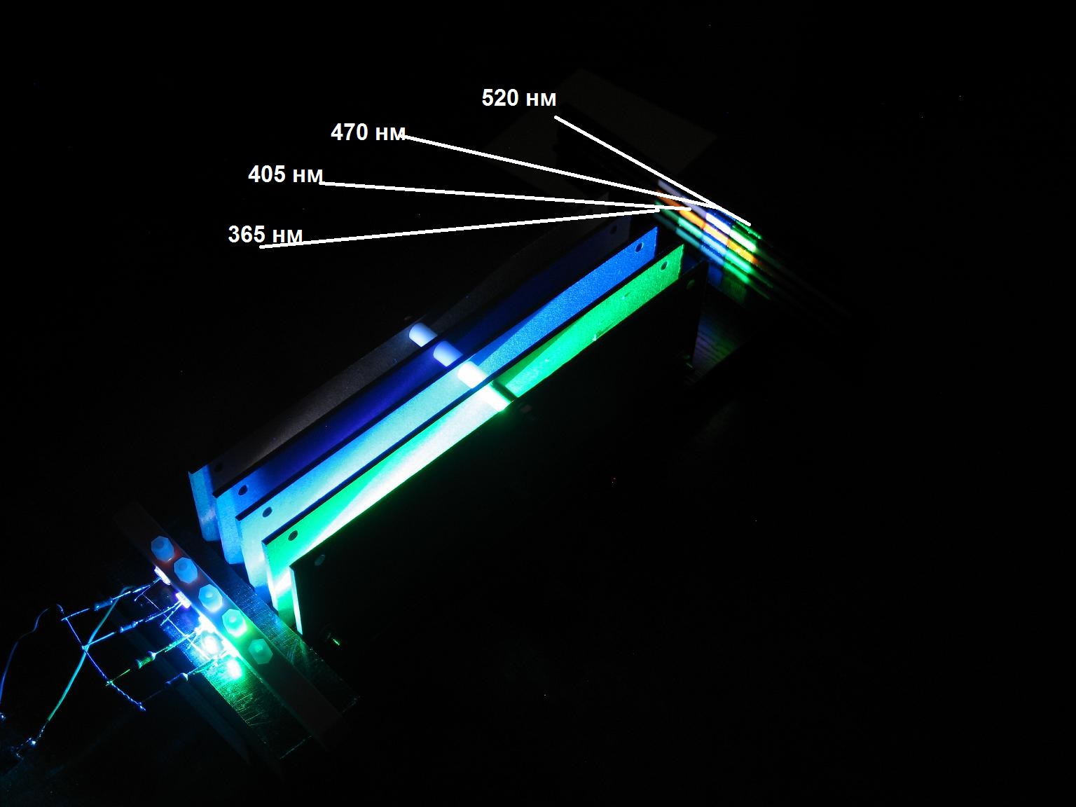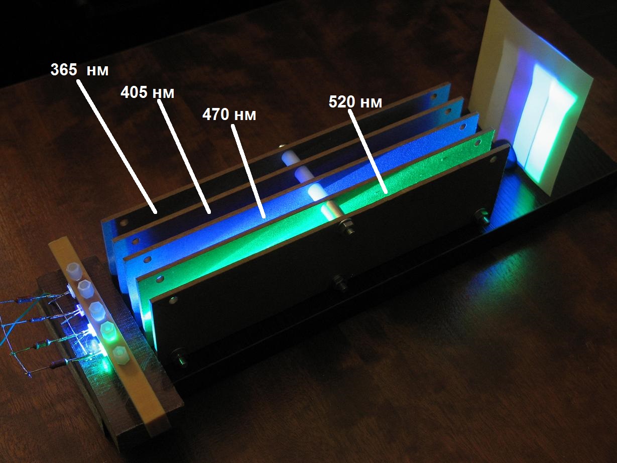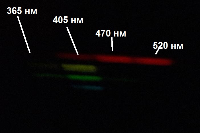 Желающие могут повторить, документация полная . Что можно сказать об эффективности этого устройства. На льду я специально в соседних лунках размещал удочки с одинаковыми мормышками, при этом одна удочка была с ноу-хау. Статистика, конечно, небольшая, но могу сказать, что при слабом клёве на спец удочку клюёт чаще. Когда клёв веселее, преимущество малозаметно. На этом мой творческий запал не прошёл и , готовясь к сезону 19/20, решил поэкспериментировать с формой и цветом люминофора. В магазинчиках обычно продаются мормышки с зелёным цветом свечения, поэтому я побегал по друзьям и достал 4 вида люминофоров – красный, жёлтый , зелёный и синий. Далее небольшая информация для тех, кто собирается изготавливать мормышки самостоятельно. В первую очередь нужно определить, чем стимулировать имеющиеся люминофоры. Физики снимают спектр возбуждения, для этого требуется непростое оборудование. Но отчаиваться не следует – наша задача облегчается тем , в качестве источника возбуждения используется светодиод, а видов их (в смысле спектра излучения) немного и потребуется выбрать наиболее подходящий для нашей задачи. В школах мы учились давно и многое забыли, поэтому я решил , что для понимания процесса, будет полезно привести несколько постановочных снимков. Для наглядности свои люминофоры я нанёс на подложку (на фото указан цвет люминесценции):