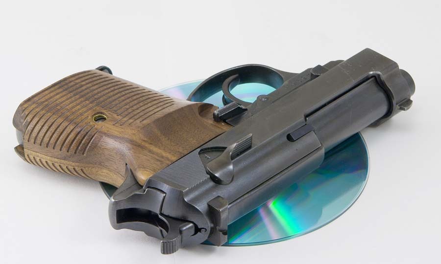 Идем далее. Сидит пистоль в руке хорошо, хват удобный, прицельные приспособы обычные пистолетные. Целик закреплен не на кожухе затвора, а на боевой личинке, что может приводить к его сбитию. Зачем так сделали? Не знаю.