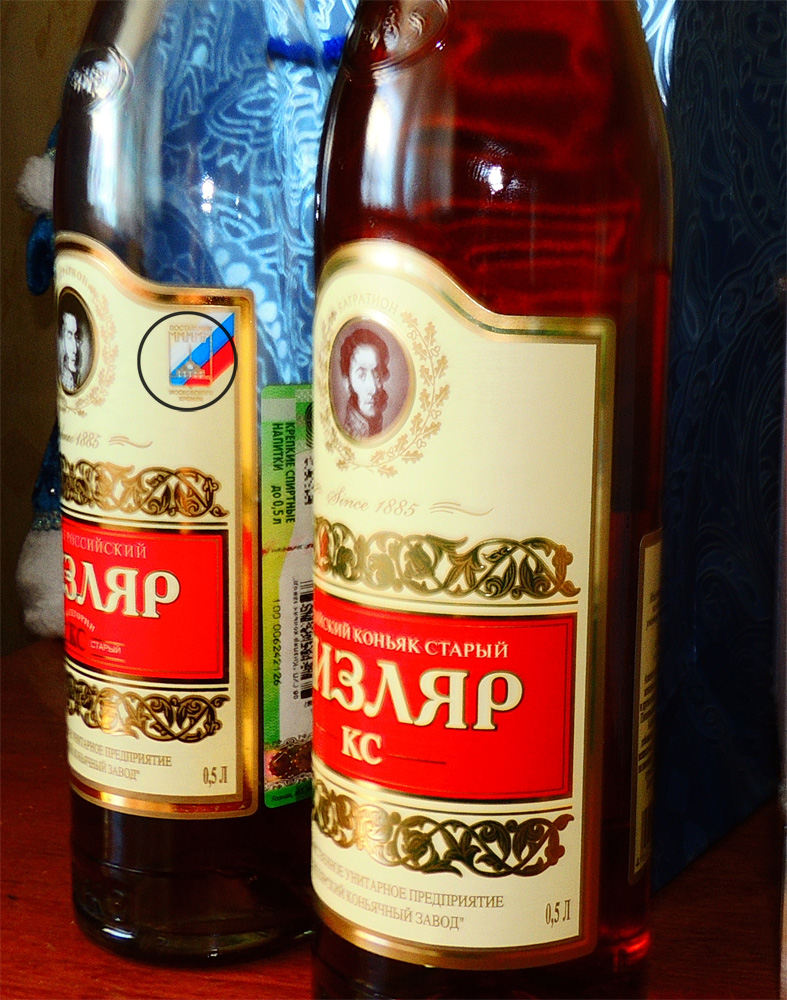 Где то пару недель назад принесли мне бутылку коньяка Кизляр КС. Аромат, вкус - непередаваемые! Сбоку на этикетке стоит значок "поставщик Кремля". Захожу сегодня в очень приличный винник и прошу Кизляр КС. Достают бутылку, в коробке, я ее открываю, смотрю - да, все так, как на той бутылке, что я пил. Но нет значка "поставщик Кремля". Я, мол, так и так, где лейба, а продавщица говорит, что кизлярскому заводу запретили теперь его ставить. Ну ладно, плачу 960 руб., прихожу домой, открываю. Запах не тот, простой ординант явно, цветом посветлее, и на вкус совершенно не то. Вот на фото для сравнения, кружком отмечен знак.