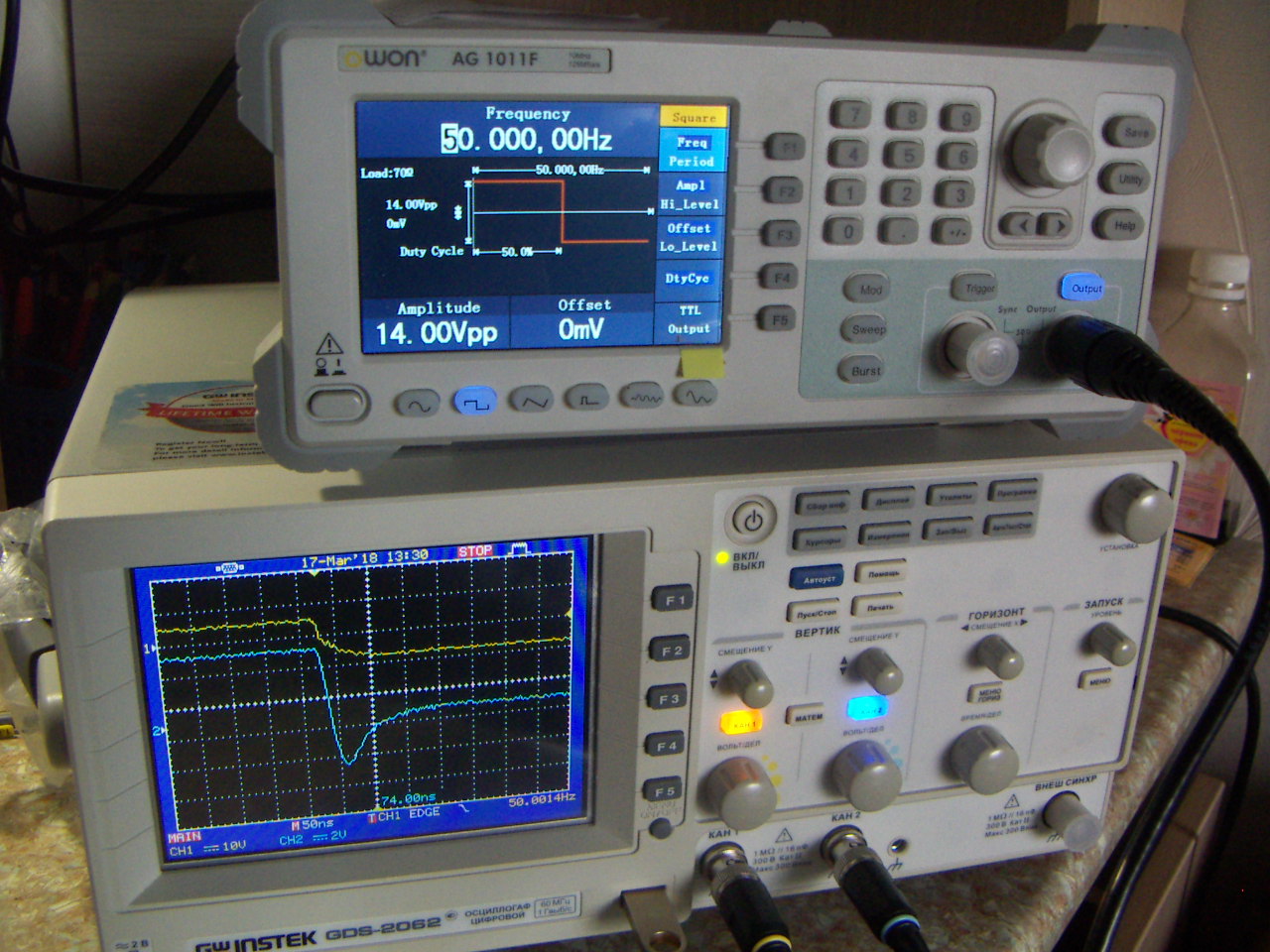 Сигнал 1 кгц, на нагрузке 30 вольт(точка "В"). Получается выходная мощность 150 ватт. Ток должен быть 5 Ампер.