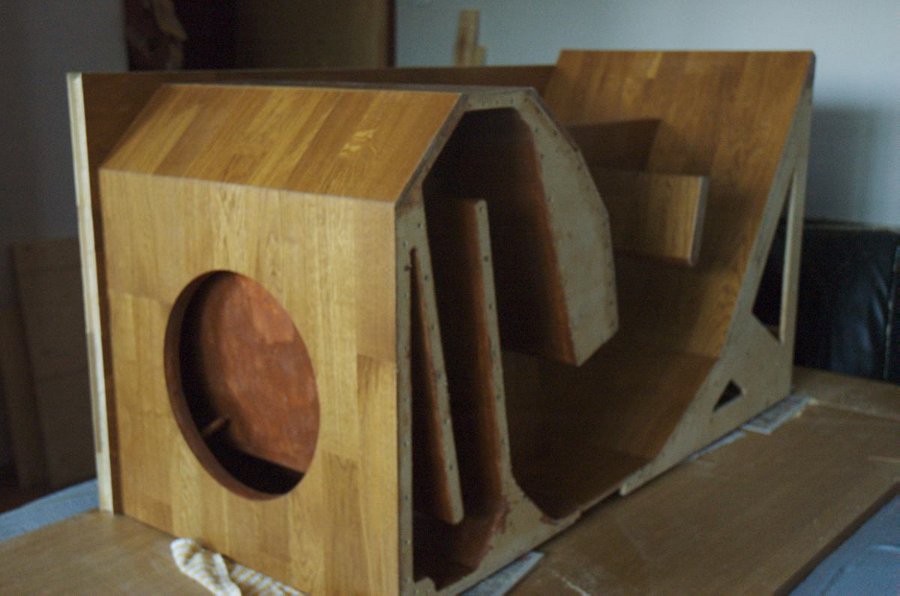 Начал я с басового рупора BigBarbarisHorn - клоном басового рупора за автором Бориса Борисовича Мокшанцева. Насколько помню, тут катеноида 2.3м., устье 0.7м2. Материал - бутерброд из фанеры и паркета (дуб плюс берёза). Живёт там 2А-9.