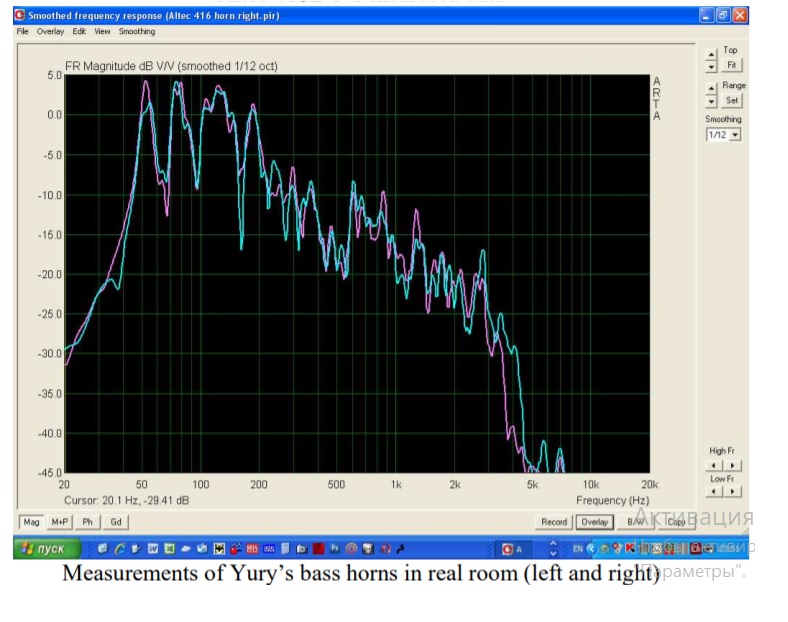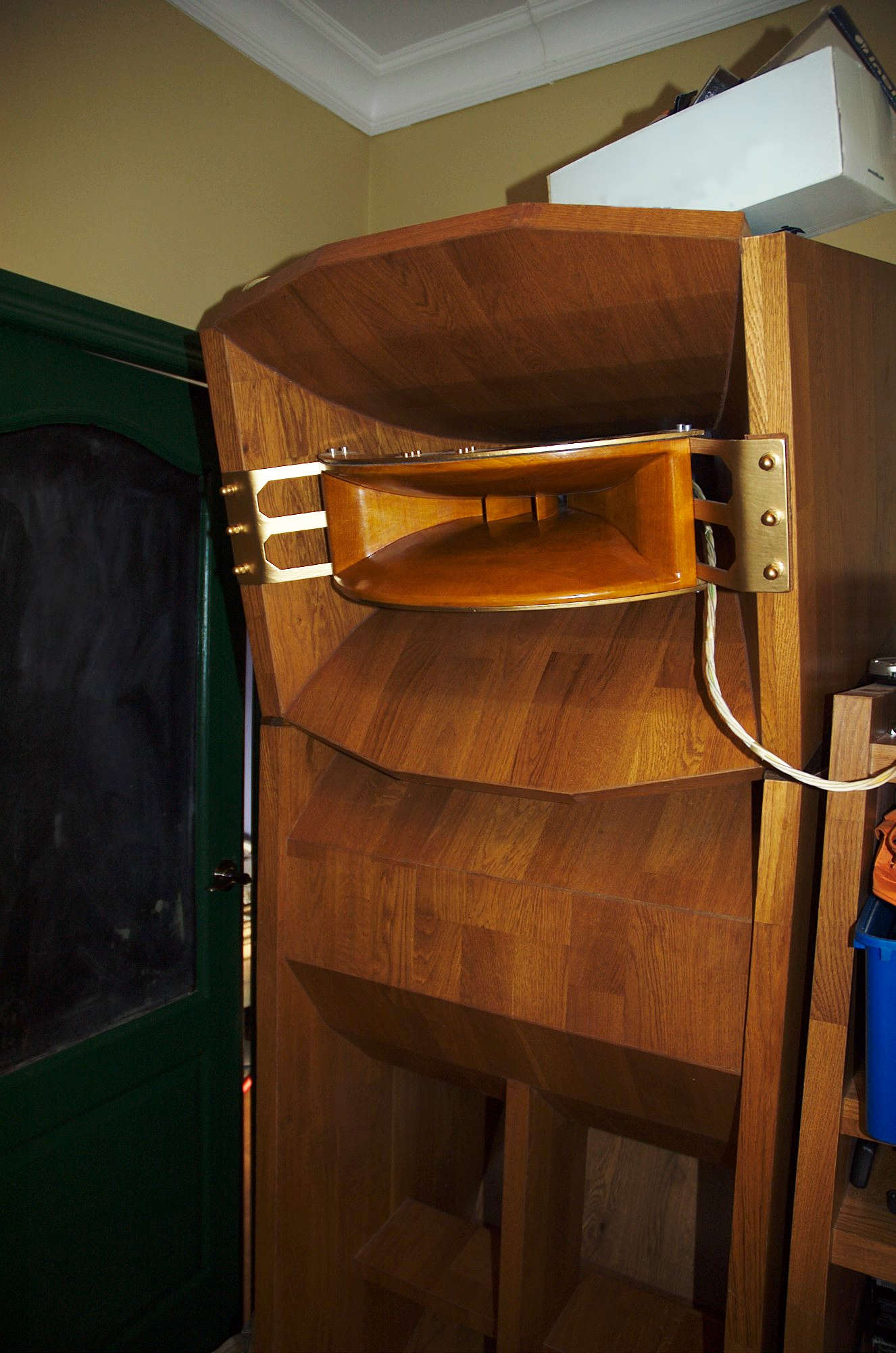 Коаксиально установлены рупора на 400 Гц из массива бука (почти клон рупоров для 1А-20), в них - динамики, сделанные из 1А-20 (в основном изменения касаются образующей горла и фазового тела) с шёлковыми мембранами. Выше пока ничего нет (потихоньку определяюсь).