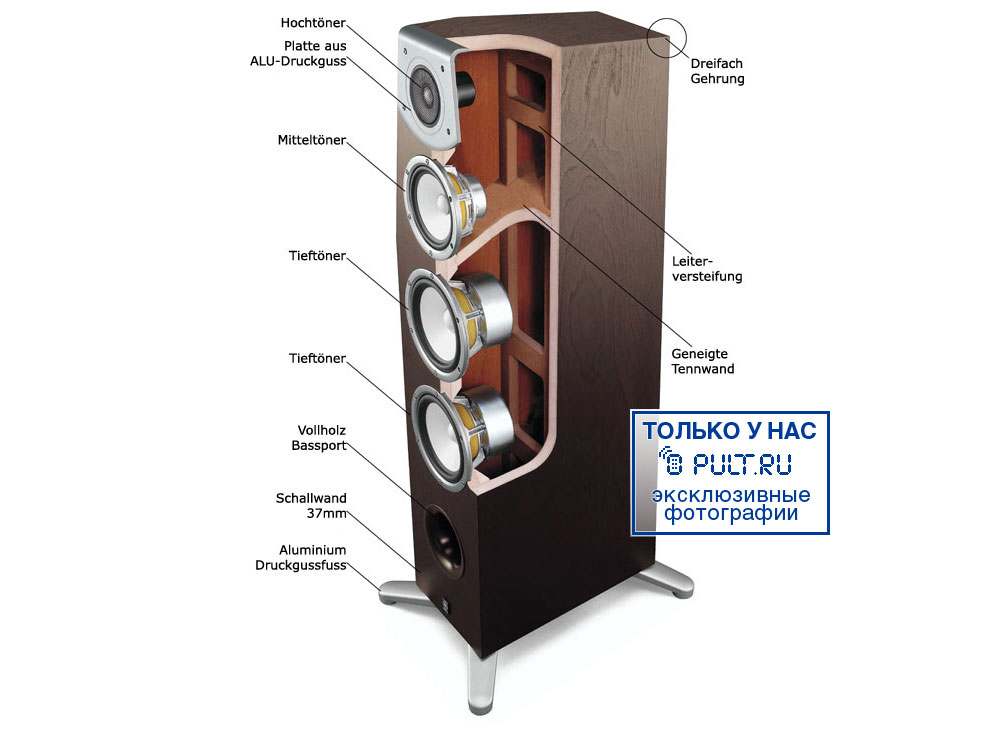 Двухкамерный корпус (НЧ- и СЧ-динамики разделены наклонной перегородкой) с вертикальными элементами жесткости