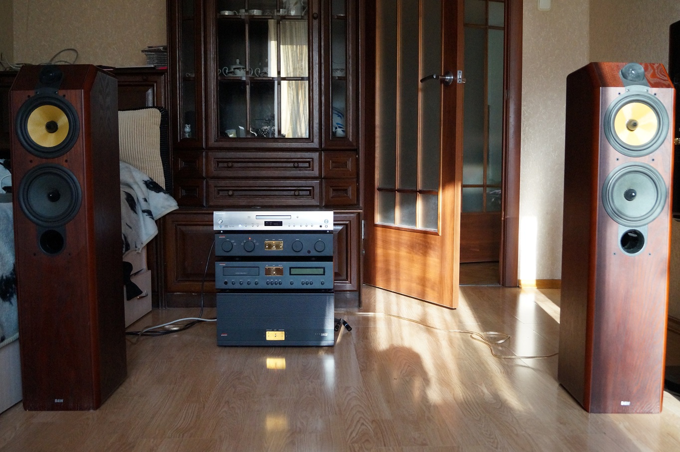 А круто аббревиатура напоминает кое-что из нашего прошлого, я даже скажу что - ОбКом КПСС))) прошу ничего не делать с названием темы - онo идеально (а то иногда портятся великие художественные замыслы). Первую часть фразы конечно все поняли, но вот по второй объяснение будет чуть позже, я хочу нагнести обстановку тайны, создать покров таинственности и приключенческой мистики, в духе Жюль Верна (кстати, это небольшая разгадка второго слова). И я знаю одного хорошего человека - нашего с вами форумчанина, настоящего исследователя неведомых пространств, которому хочу написать огромную благодарность за этот маленький кусочек радости сегодняшнего дня - ведь без него этой покупки бы не произошло. Вкратце пробегусь по этому замечательному трёхкомпонентью, сделанному аж в далёкой Омерико. Балансный CD-проигрыватель Adcom GCD-750 - основательный такой брутал, обнаружил в нем цифровой коаксиальный вход - может, он это, работает в качестве ЦАПу? Я правда пока не знаю, продолжим исследования Гугла. Написано, что аналоговый выход работает в классе А. Балансный пред GFP - 750 - по крайней мере две новые доселе неведомые для меня фишки - на нем написано MOSFET - то есть я так понимаю в нем на усилении стоят здоровые металлические транзюки, а ведь это пред. Только пред. Только пред. Только пред. - попробую песню написать с таким припевом. Вторая фишка - пред тумблером переключается полностью в пассивный режим и работает как селектор и ручка громкости, не привнося усиления в тракт. Вообще про эти тумблеры стоит напесать отдельно - на позолоченной пластине такие щелкающие тумблеры - щелкаешь их так тумбл, тумбл тумбл... Я на них прощелкал первый куплет песни Тумбала-тумбала- тумбалалайка, даже на одной из пластин появилось изображение Ефима Шифрина. Ну и мощник - здоровый такой 22 кг монстр, модель GFA-5802. Тоже разумеется балансный. Увидел в инете нутрянку, сколько в нем транзисторов, ужаснулся - держать такое дома вряд-ли возможно, 450 Ватт на канал. Один неосторожный поворот ручки громкости ребенком и кранты любой из пар колонок. Мощник ощутимо греется, поэтому это сооружение я эксплуатирую интервалами по 20 минут, а разложить не могу - обе пары балансных проводов слишком коротковаты. Радость от первого включения немного подосралася - СД так и не включился, что-то видимо с током. Да, я сразу подумал что с электротоком могут быть проблемы, ведь аппарат не включали 10 лет, он элементарно разучился кушать ток, и он кстати был единственным, что я не проверил при покупке, да и хрен с ним, собственно, починим, что мы, не кабаны что ли. И именно поэтому на фото вы видите другой проигрыватель, который кушает ток нормально, на ежедневной основе. В качестве колонок мы поставим новоприобретенную пару Вилкинсов-Баверсов, которые в принципе хорошо себя зарекомендовали в качестве тестовой пары первого раза. Играют аппараты очень хорошо, бочка очень натуральна (хотя мне традиционно хотелось бы её больше), голос вкрадчив. Высокие тарелки, как и низкие, разносят звон исправно, даже пыльца с цветов, оставшихся от 8 марта, безнадёжно находящихся в своем периоде дожития, дрожит и вибрирует тысячами очаровательных индивидуальностей.