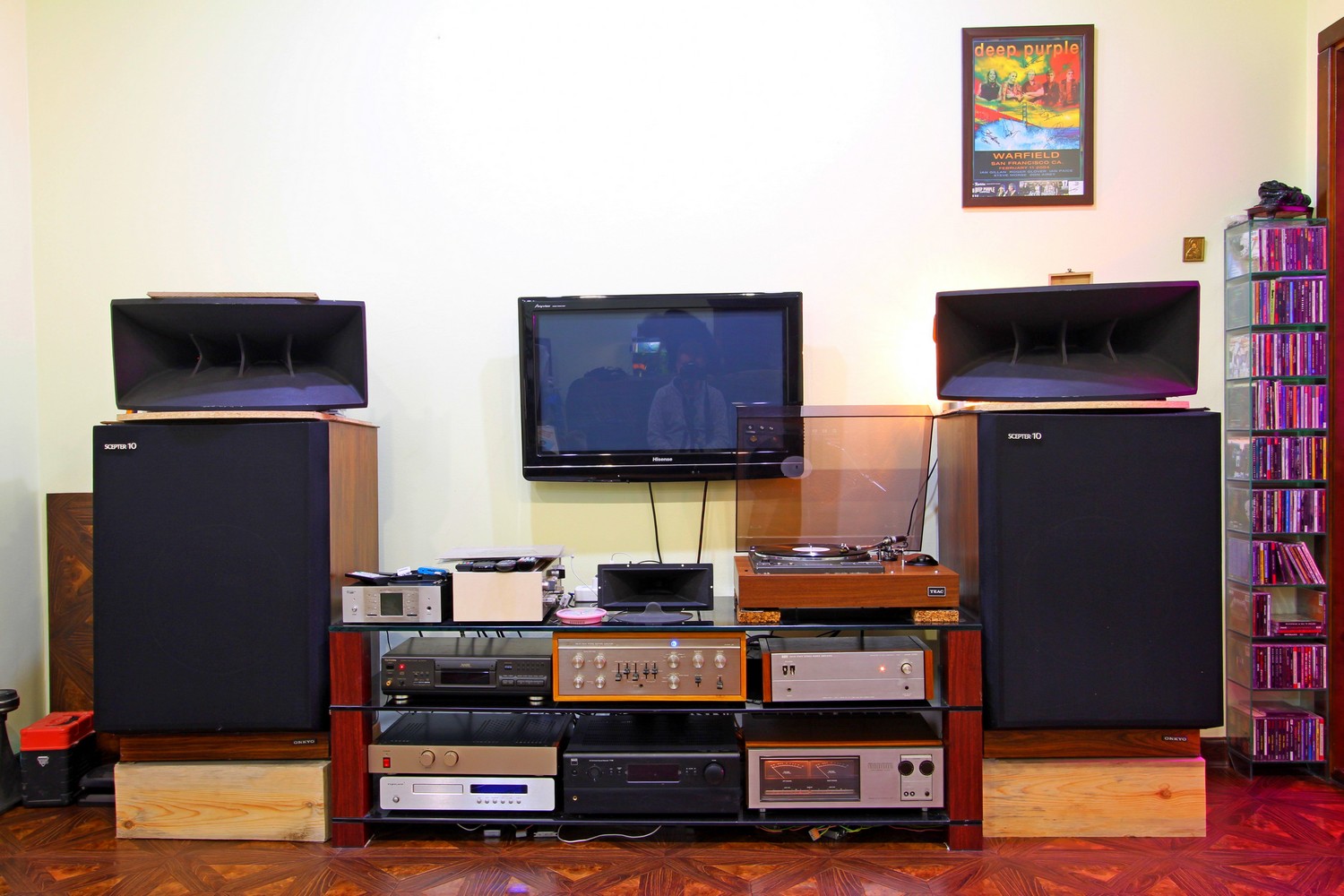 Акустика поднялась еще чуть выше над полом на массивные бруски. Рупора, наоборот, чуть наклонились вниз, и под небольшим углом направлены на слушателя.