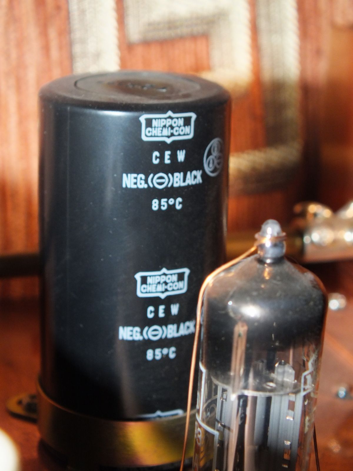 Корпус медь , разводка схемы очень аккуратная навесом с использованием панелек . Огромные кондесаторы от AudioNote с маркировкой.