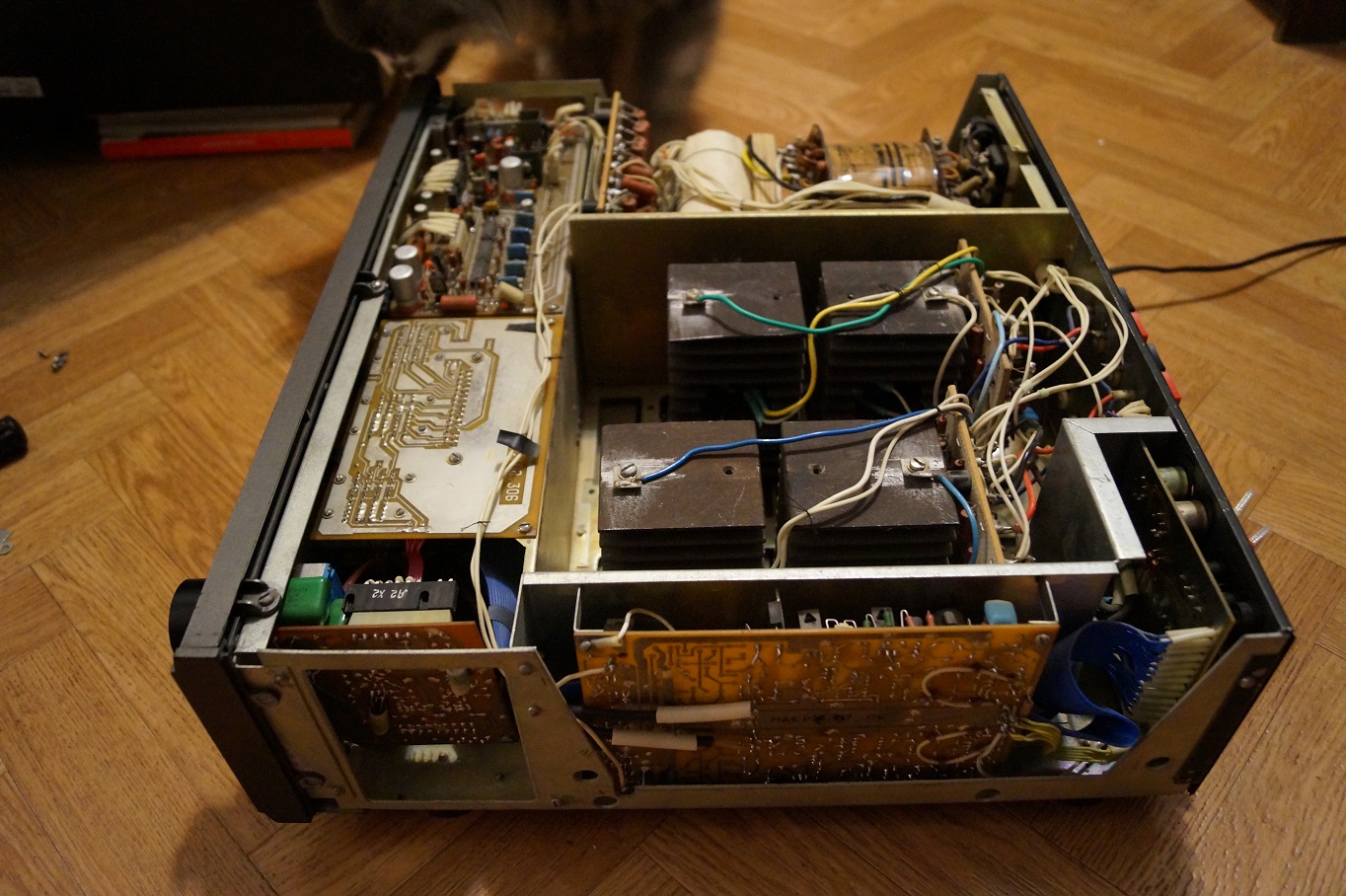 И сегодня с утра я его очень внимательно слушаю. Аппарат демонстрирует глубокое, очень насыщенное, богатое гармониками звучание - в точности такое же ощущение оставляли хорошие западные винтажники, в частности, Hitachi HA-610. Аппарат играет настолько убедительно, что напрочь забываешь что это отечественный продукт. Низкочастотная составляющая - именно та, за которую я очень ценил винтажные аппараты, и которую так редко можно встретить в современных, даже функционально насыщенных (отчасти почему я и пришел к моей концепции трифоника, и параллельно - создания ламповых предварительных усилителей со схемотехникой ТБ и ТК винтажных аппаратов). Усилитель невероятно мощный - даже ослабление минус 20 дБ не особо спасает - ступенчатый аттенюатор громкости поставить в нужное положение довольно сложно. Все регуляторы усилителя - трещотки. Усилитель однозначно оставляет очень хорошее впечатление, и я рад что проект удался. Собственно, это часть проекта - я всегда хотел собрать отечественную систему из достойных аппаратов, "отточить" ее, отпрофилактить, поместить куда - нибудь в укромное место на будущее, чтобы когда будет побольше места, затем развернуть её. Для этого уже есть виниловая вертушка Электроника Б1-01, полностью рабочая и отлично звучащая, теперь буду подыскивать акустику. Что-то большое, но не s-90 конечно. Возможно, Корветы 150АС, или Электронику АС-063 или типа того.