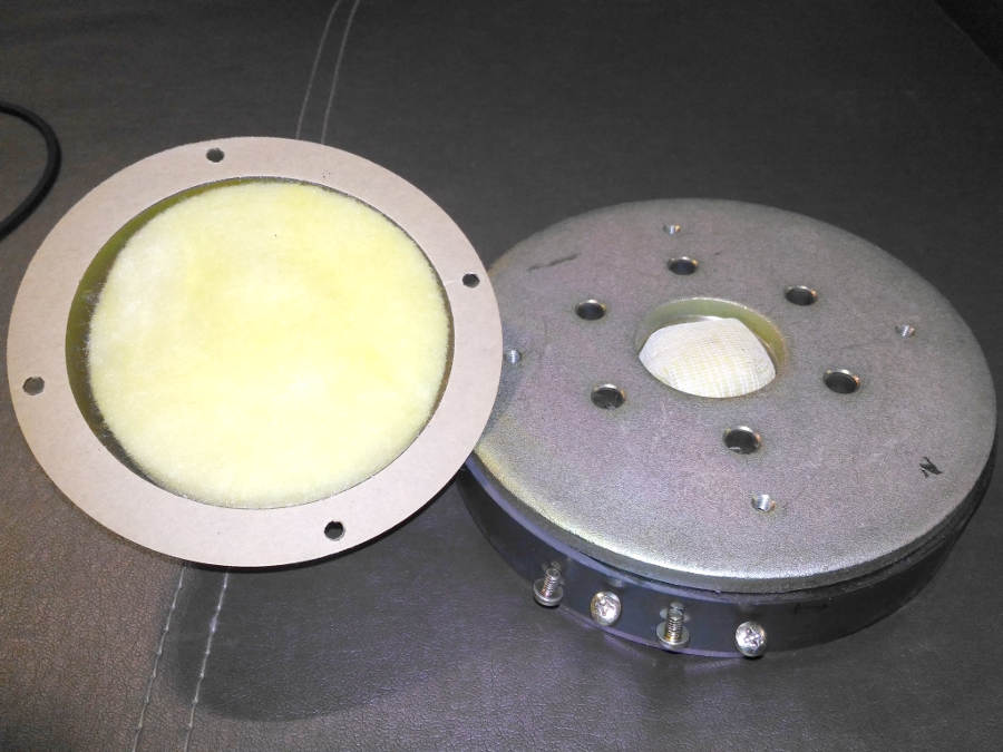 на них каких-либо мастик и с внутренней стороны имеют заметную "вафельную" текстуру, не похожую ни на тканевую, ни на поролоновую, однако весьма похожую на следы прессования бумажных диффузоров. На ощупь - твердый тонкий сухой материал, очень похожий на бумагу (возможно, с некой пропиткой), на просвет артефактов тканевого или пористого резинового/поролонового материала не видно (полностью светонепроницаемы). Признаков нанесения дополнительных покрытий, как сказано выше, абсолютно нет. Таким образом, вопреки встречавшимся в интернете упоминаниям, что они сделаны из бутилкаучука, я полагаю, что в основе подвесов все-таки бумага. Скорее всего, то-же самое относится к аналогичным среднечастотникам "смежных" серий Диатонов.