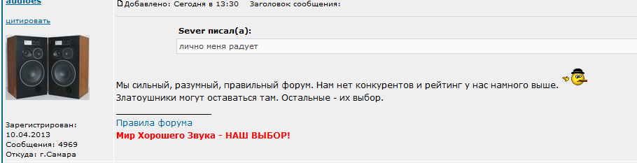 1. Тем более, что те, кто эти аудиомифы распространяет, получают от этого прибыль: или финансовую (за дорогие компоненты), или политическую (явяясь гуру, которых почитают "рядовые верующие") и действуют очень активно. Поэтому аудиомифы активно и деятельно насаждаются среди народа - вербуются потенциальные покупатели и потенциальная паства