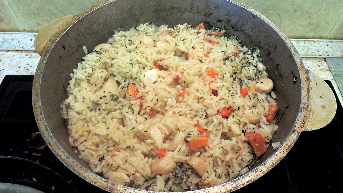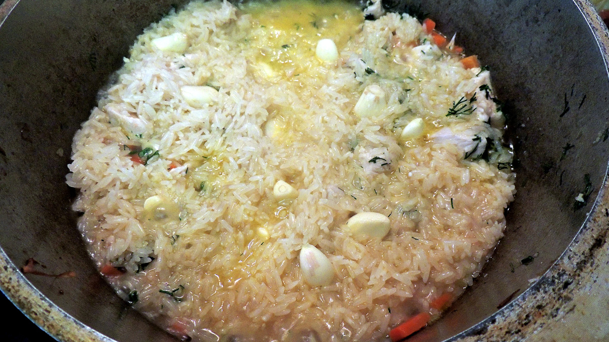 Ежели в "скважине" булькает лишь на самом дне - все, плов готов, можно снимать с огня и перемешать.
