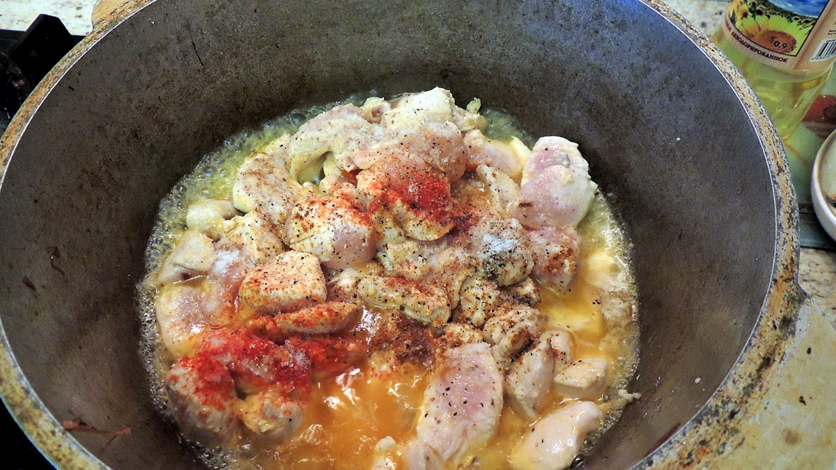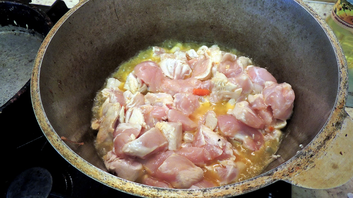 Затем нужно убрать лук-морковь из казана и быстро обжарить филе с карри, перцем, укропом и паприкой, обычно это делается на большом огне минут за 5,