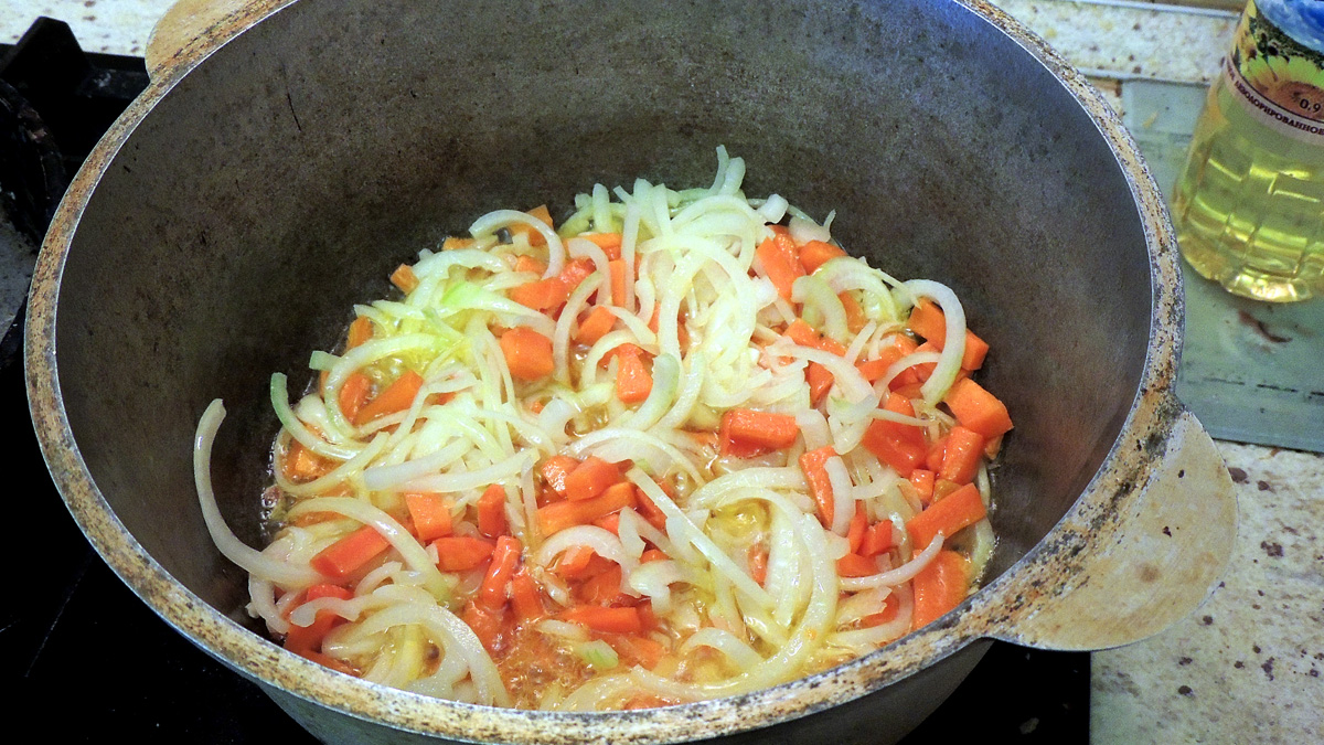 В казане сильно разогревается масло, увы, не хлопковое, а подсолнечное. Сначаля я обжариваю морковь, потом лук, хотя некоторые предпочитаю наоборот. Но... дело вкуса.