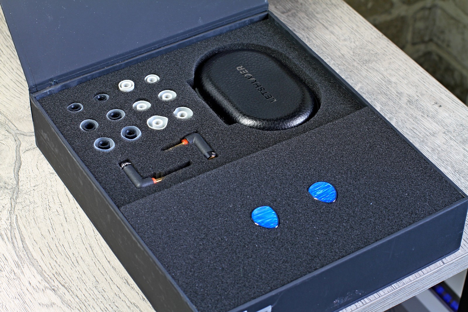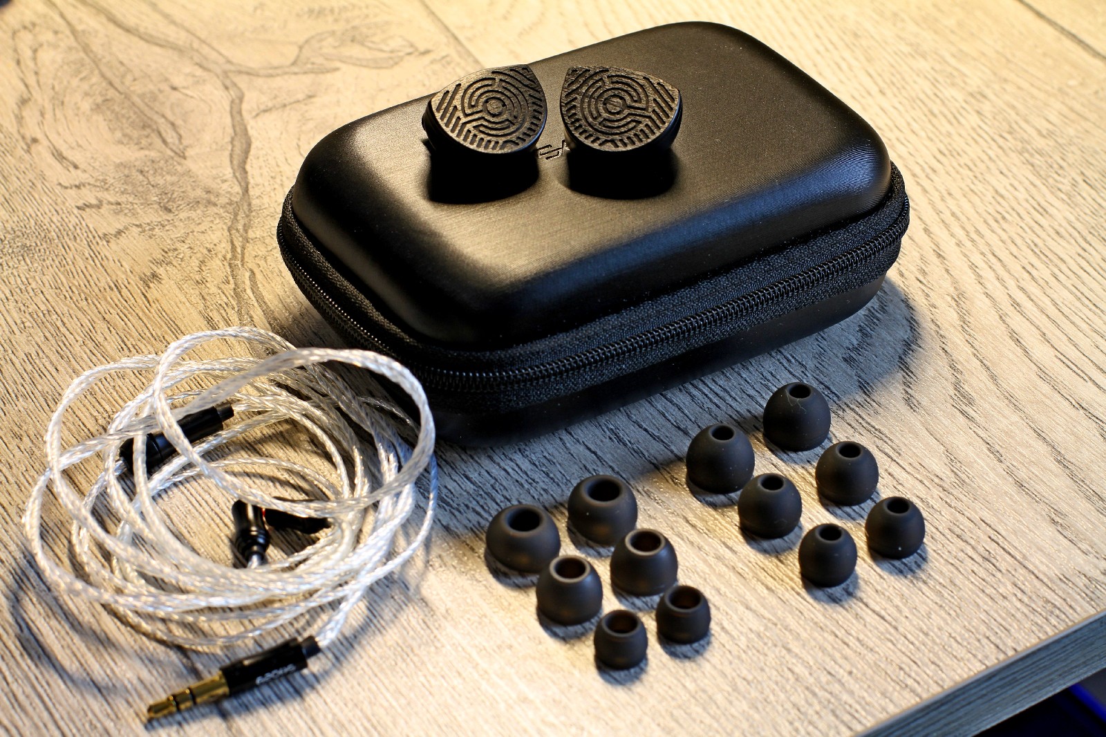 Защитный кейс, хотя и брендированный, но выглядит дешево. Впрочем, с поставленной задачей он справится – кофр вместительный и жесткий на ощупь. Амбушюры стандартные, с широкими и узкими соплами (каждого вида по 3 пары, размеров S, M и L). Сидят хорошо, отторжения не вызвали. Кабель очень тоненький, в прозрачной оплетке, с посеребренными жилами и микроскопическим джеком 3,5 мм на конце (опционально можно заказать с балансным джеком 4.4 мм).