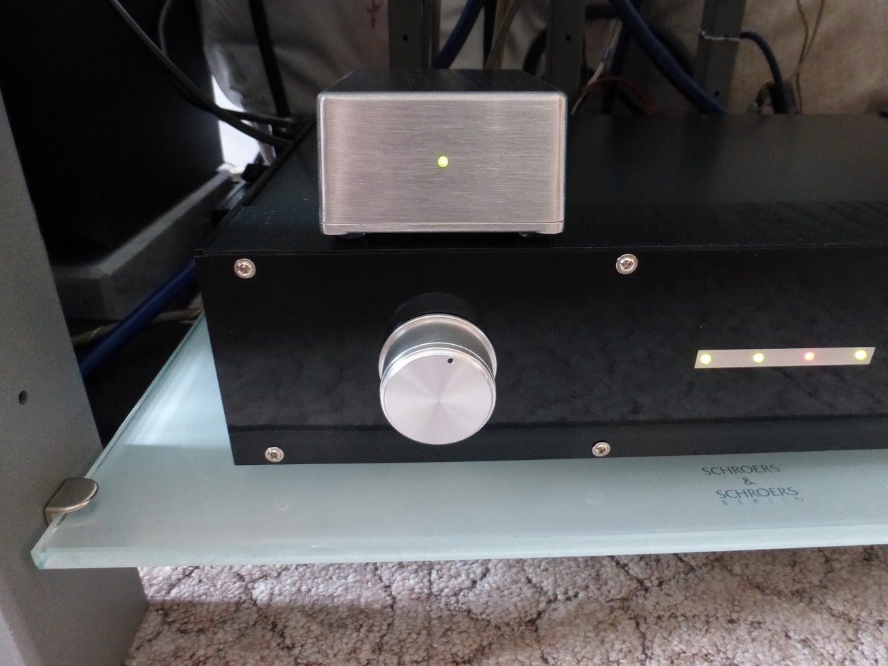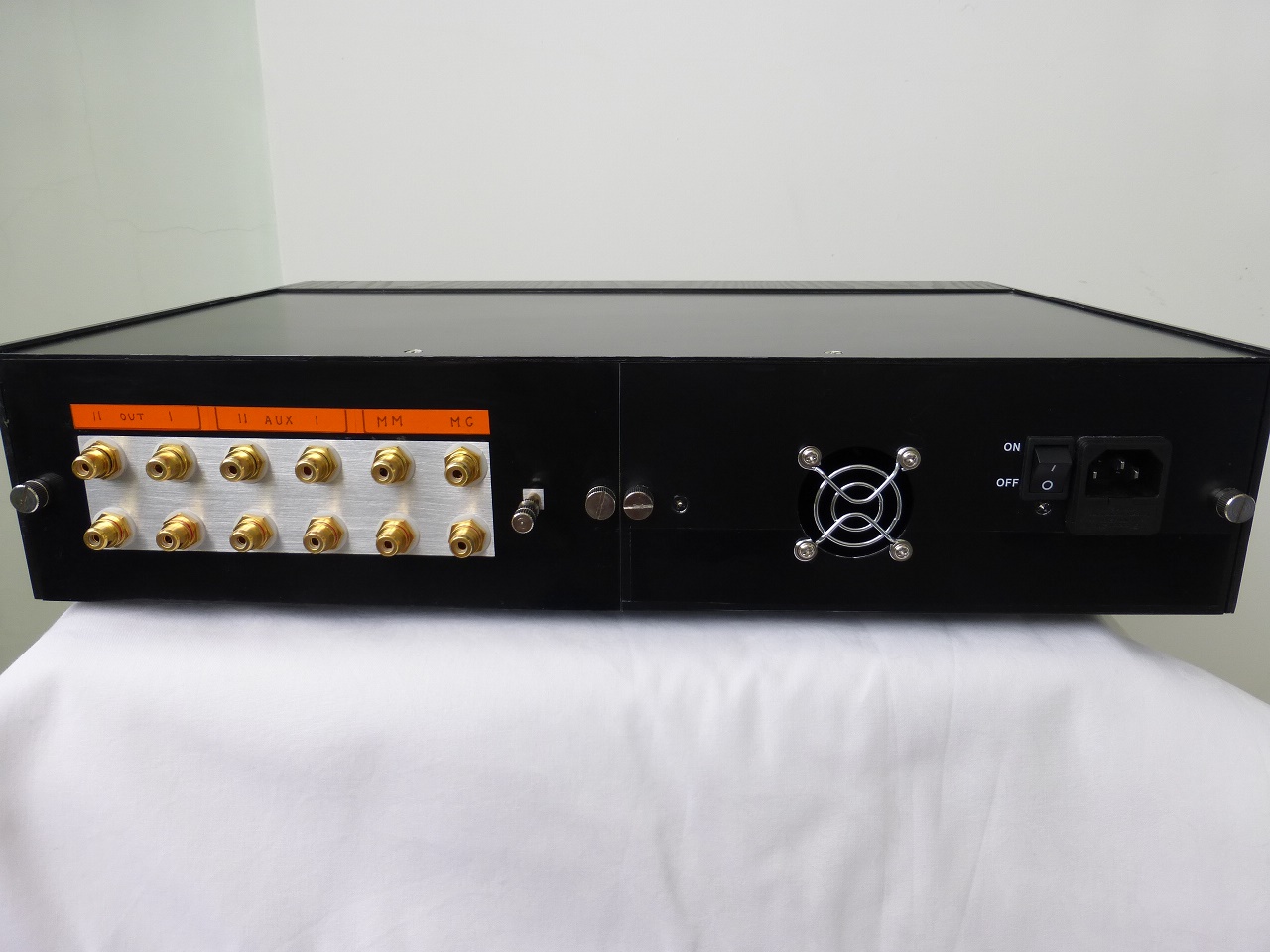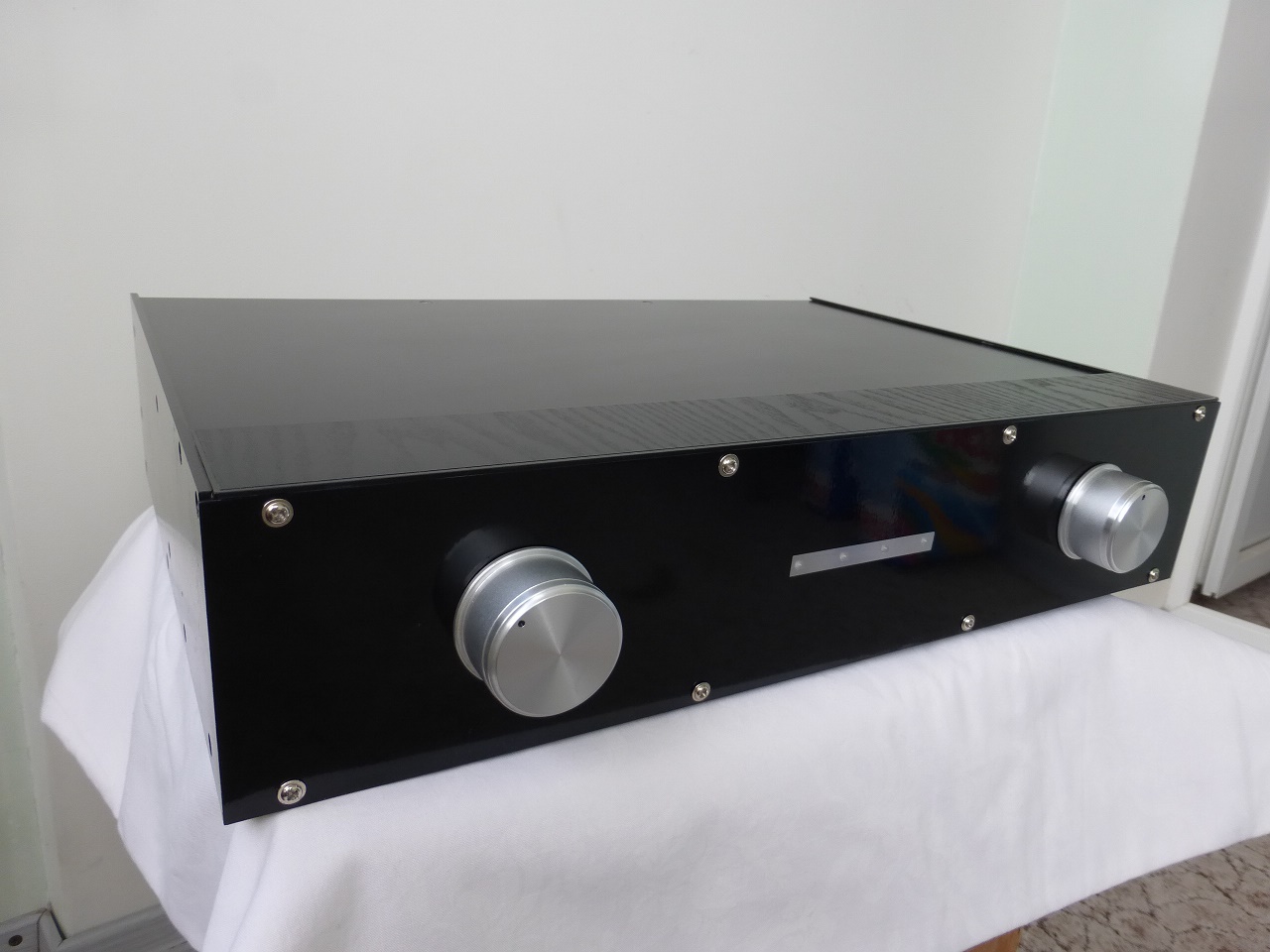 Предлагаю вашему вниманию, пассивный коммутатор входов с регулируемым выходом (двумя) .Идея собрать такой пассивный пред с двумя RIAA корректорами на борту и имеющий регулятор выходного уровня сигнала,родилась скорее случайно.Хотя конечно ,любое случайное решение,это возникшая необходимость в таком изделии.Был изготовлен опытный образец,несколько месяцев назад.Показал себя с хорошей стороны.И был одобрен старшими ,более опытными, товарищами.В последствии был приобретён в Москве.И поступила заявка на изготовление, ещё одной такой же модели.Что и было выполнено Виктором.И вот аппарат, наконец то у меня дома .Сейчас проходит проверку работоспособности в моей системе.И так что мы имеем? В алюминиевом корпусе отделанным немецкой клеящейся плёнкой .И имеющей размер 19" РЕК.Собраны два высококачественных RIAA корректора.Один из них имеет входное сопротивление 47 ком.И предназначен для работы с ММ головками.Второй RIAA корректор имеет входное сопротивление 100 ом.И заточен для работы с МС головками.Далее имеются два линейных входа для внешних источников.Переключение входов осуществляется с помощью сигнальных японского производства.Переключение происходит, при подаче управляющего напряжения с галетного переключателя.Два равных выхода имеют регулировку уровня выходного сигнала с помощью сдвоенного переменного регулятора ALPS 10 ком.На передней панели имеются светодиодные (двухцветные) индикаторы входов "зелёного" цвета.Если какой то вход активирован,то свечение светодиода меняется на "красное".Применены при изготовлении, только высококачественные компоненты.Причём все проходили отбор и входной контроль.Уровень звучания?Хотя ещё не прогрелся,уже начинает впечатлять..