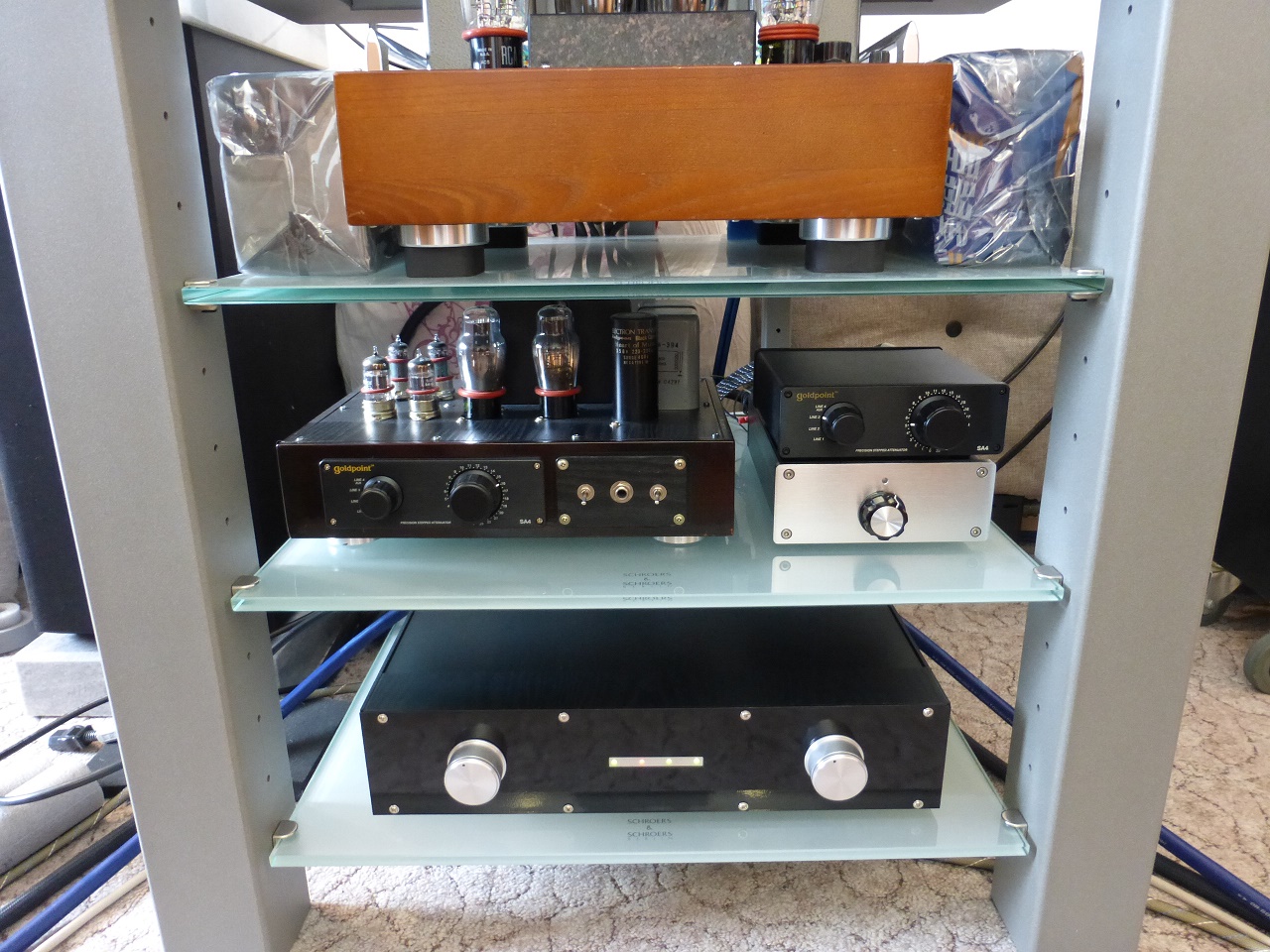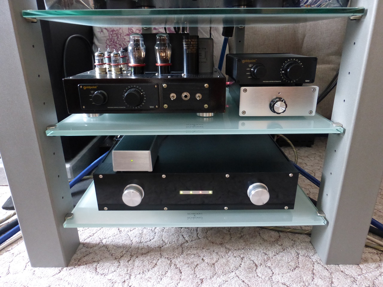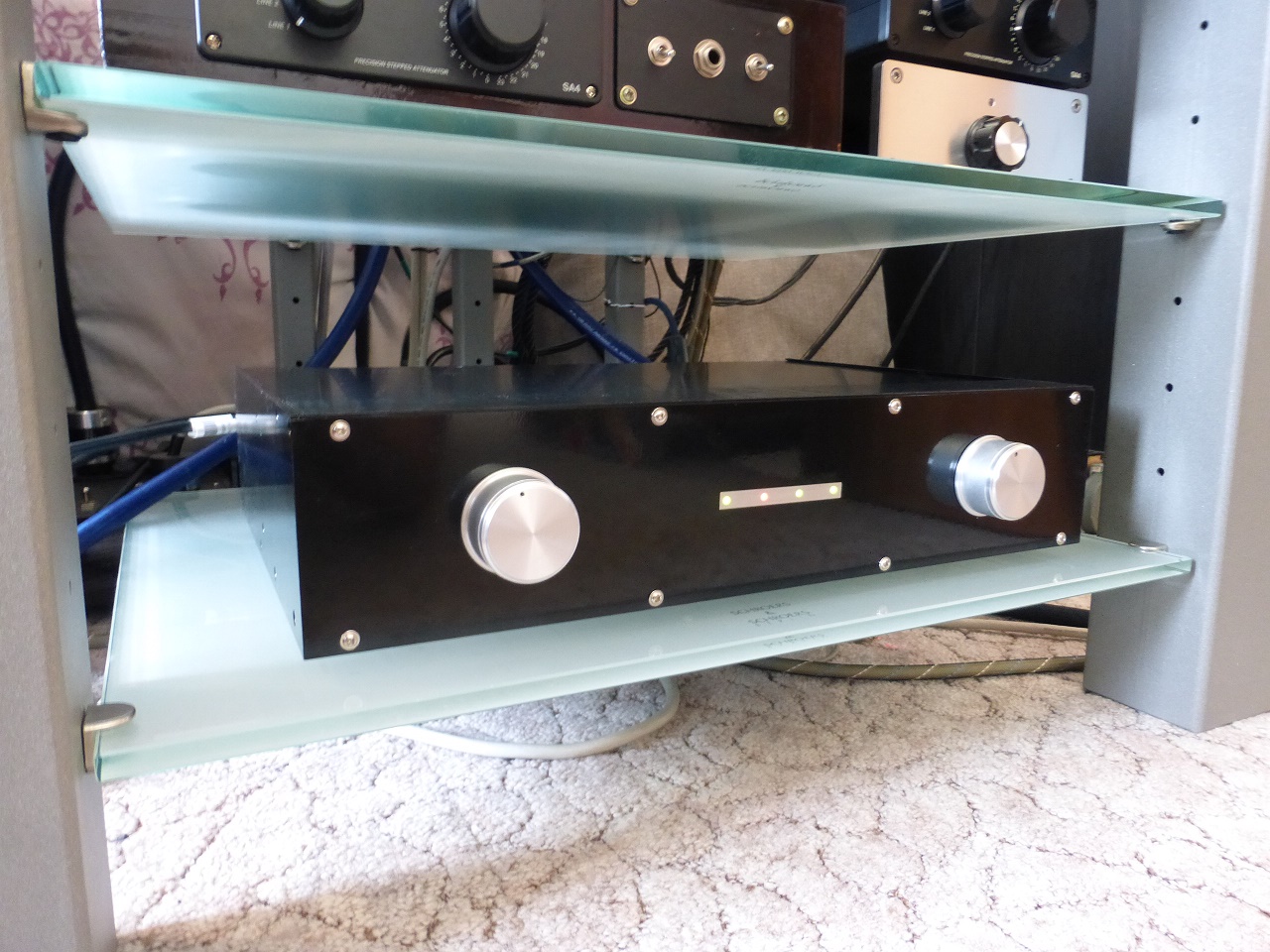 Предлагаю вашему вниманию, пассивный коммутатор входов с регулируемым выходом (двумя) .Идея собрать такой пассивный пред с двумя RIAA корректорами на борту и имеющий регулятор выходного уровня сигнала,родилась скорее случайно.Хотя конечно ,любое случайное решение,это возникшая необходимость в таком изделии.Был изготовлен опытный образец,несколько месяцев назад.Показал себя с хорошей стороны.И был одобрен старшими ,более опытными, товарищами.В последствии был приобретён в Москве.И поступила заявка на изготовление, ещё одной такой же модели.Что и было выполнено Виктором.И вот аппарат, наконец то у меня дома .Сейчас проходит проверку работоспособности в моей системе.И так что мы имеем? В алюминиевом корпусе отделанным немецкой клеящейся плёнкой .И имеющей размер 19" РЕК.Собраны два высококачественных RIAA корректора.Один из них имеет входное сопротивление 47 ком.И предназначен для работы с ММ головками.Второй RIAA корректор имеет входное сопротивление 100 ом.И заточен для работы с МС головками.Далее имеются два линейных входа для внешних источников.Переключение входов осуществляется с помощью сигнальных японского производства.Переключение происходит, при подаче управляющего напряжения с галетного переключателя.Два равных выхода имеют регулировку уровня выходного сигнала с помощью сдвоенного переменного регулятора ALPS 10 ком.На передней панели имеются светодиодные (двухцветные) индикаторы входов "зелёного" цвета.Если какой то вход активирован,то свечение светодиода меняется на "красное".Применены при изготовлении, только высококачественные компоненты.Причём все проходили отбор и входной контроль.Уровень звучания?Хотя ещё не прогрелся,уже начинает впечатлять..