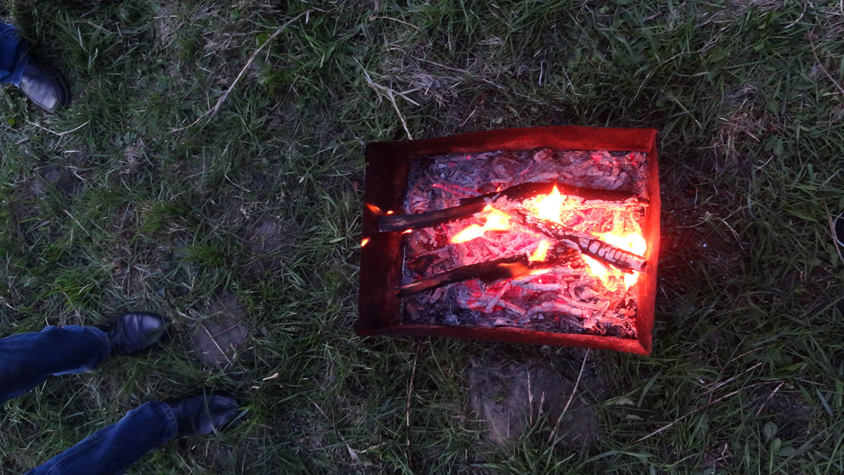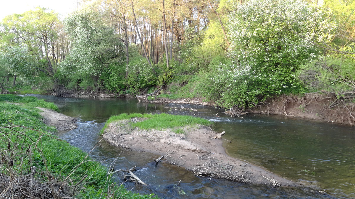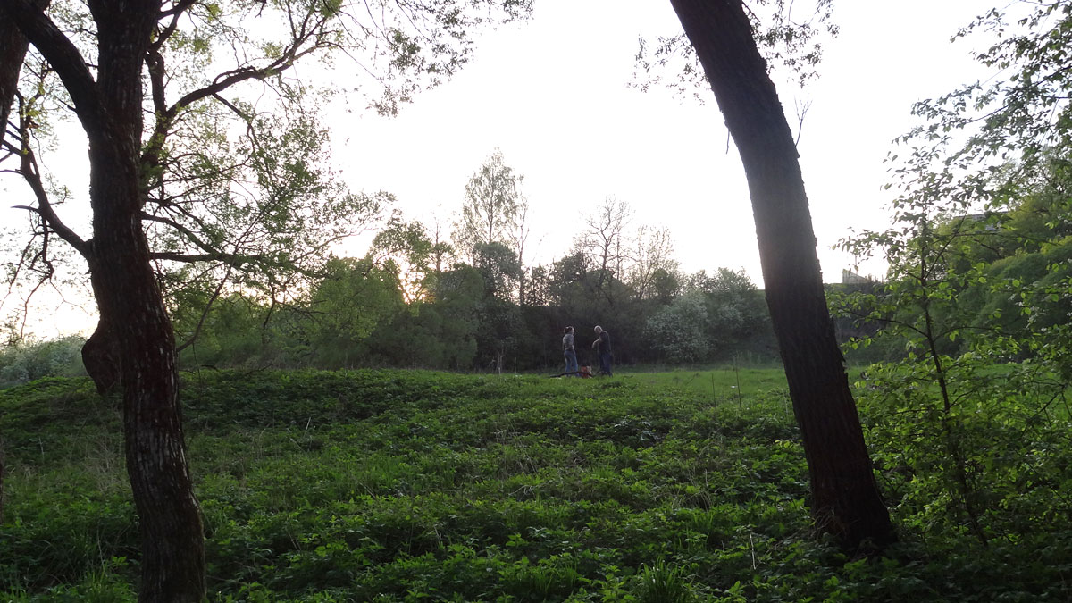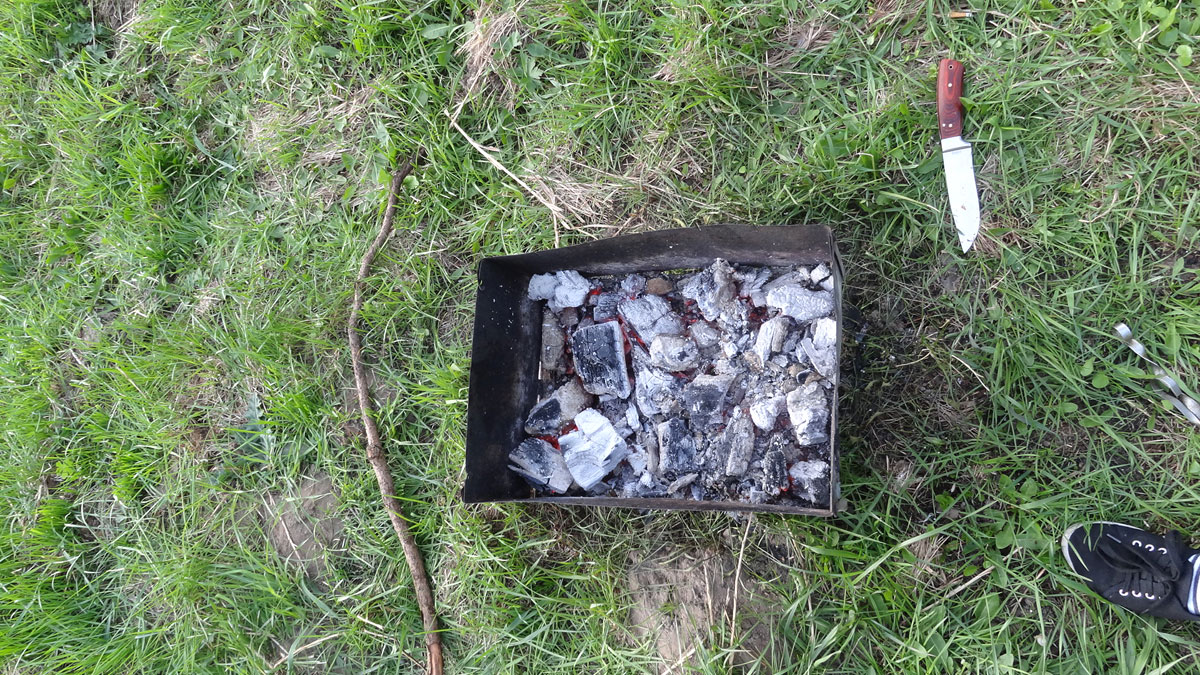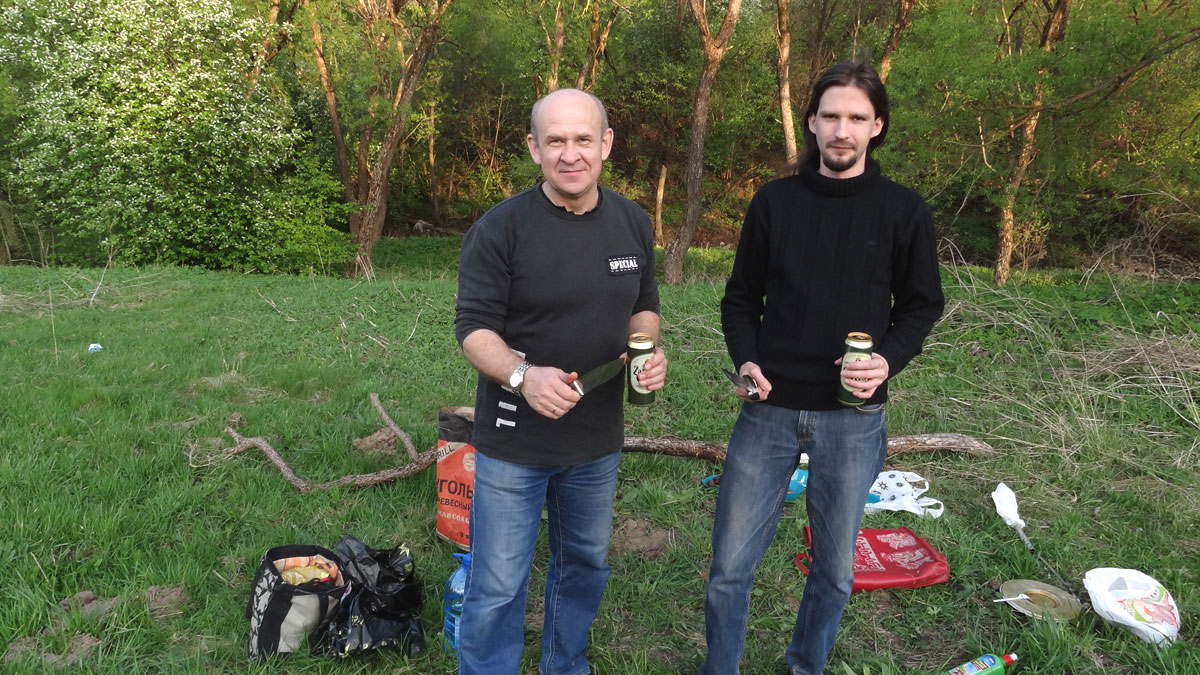 . Ну и насмотревшись на пейзажи, слегка облившись водой и не попав в музей космонавтики, мы вернулись ко мне домой. Надобно заметить, что мы люди предусмотрительные, и перед отъездом замариновали свинятину пополам с молодой говядиной, и по прибытии собрались, взяли пиво-мясо-мангал-шампуры-уголь и пр. барахло, вызвали машинку (идти 10 минут, но волочь все неохота было) и через 3 минуты были на берегу лесной речки. Свежий воздух, черемуха, соловьи орут, майские жуки идут на таран - все по полной программе