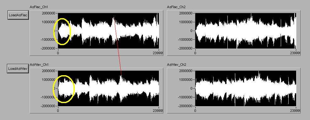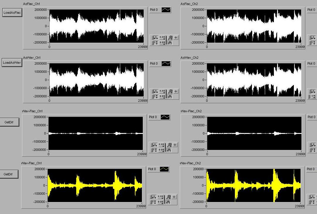 Далее некоторые результаты сегодняшнего ночного развлечения. Поняв, что был неправ с предположением, решил посмотреть файлы, любезно предоставленные Андреем (МастерУфа). Напомню, два (выложен одним файлом, но я порезал на два) варианта воспроизведения одного и того же фрагмента, проигранные фубаром во флак и в вав. Для того , чтобы проще ориентироваться в последующих картинках, скажу, как на них проименованы графики. Чтобы не таскать большие массивы, читались и выводились пятисекундные куски. Итак Ch1 и Ch2 – это канал 1 и 2 соответственно. AsWav – имеем дело с проигрыванием в вав, AsFlac – с флак. Wav-Flac – разность поточечно между вав и флак.