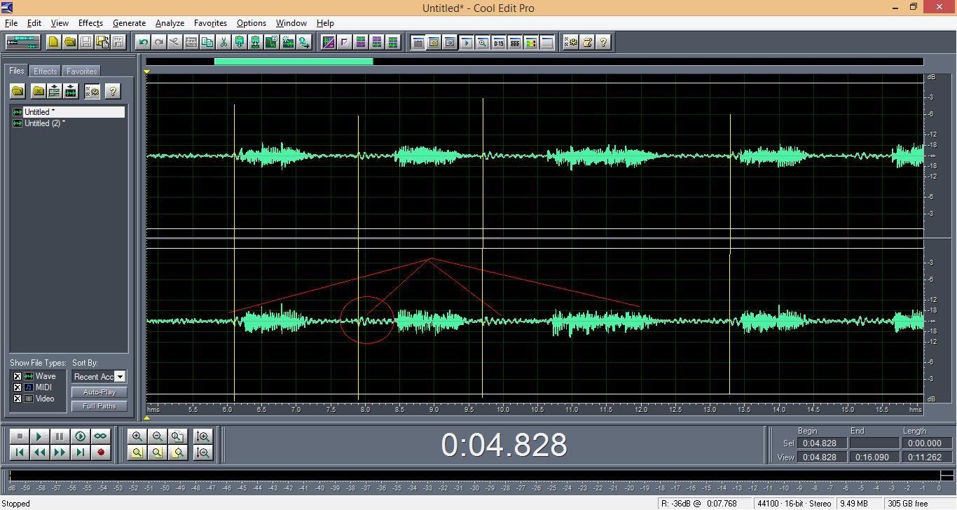 Наиболее наглядным представляется структура в районе 8-ой секунды (обведена красным кругом). В чём её природа лично я затрудняюсь сказать. Возможно, что она вызвана производственным недочётом, когда на поверхности образовались бугорки (ясно, что их несколько, идущих подряд, поэтому структура, а не одиночный всплеск.) Если это предположение принять за основу, то тогда , в силу того, что бугорки имеют конечные размеры, то они должны проявляться несколько раз (занимают несколько рядом расположенных дорожек). Это мы и видим – жёлтым цветом введены временные реперы с периодом 1.8 сек , что определено частотой вращения 33.3 об/мин . На каждом канале структура начинается в одной фазе. А вот между каналами структуры в противофазе. Все эти факты подтверждают предположение о происхождении этого артефакта. Также видно , что сумматор работает – на картинке с включённым фильтром этой структуры нет. Единственное, не очень понятно некоторое отличие в полезных сигналах, но , скорее всего, это результат отрисовки графиков.