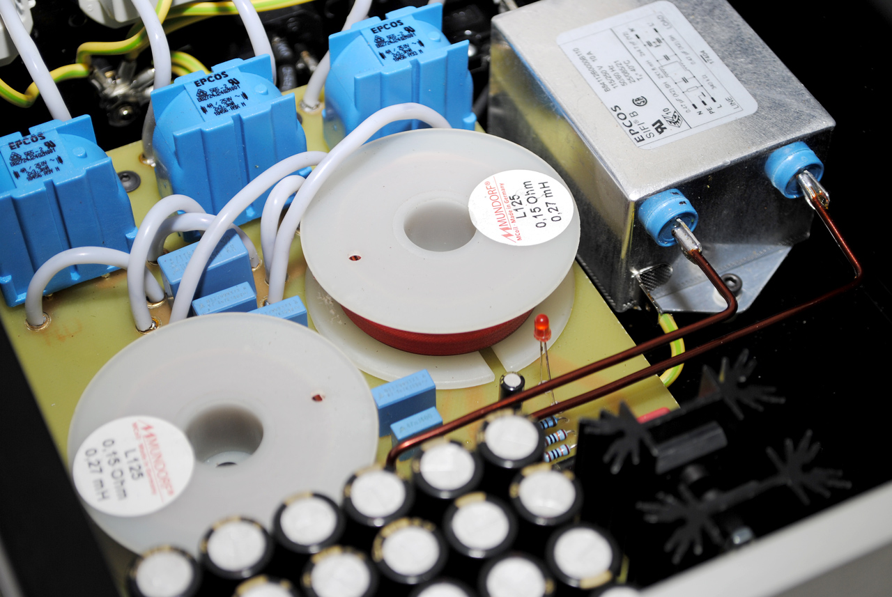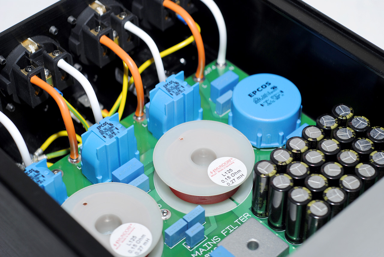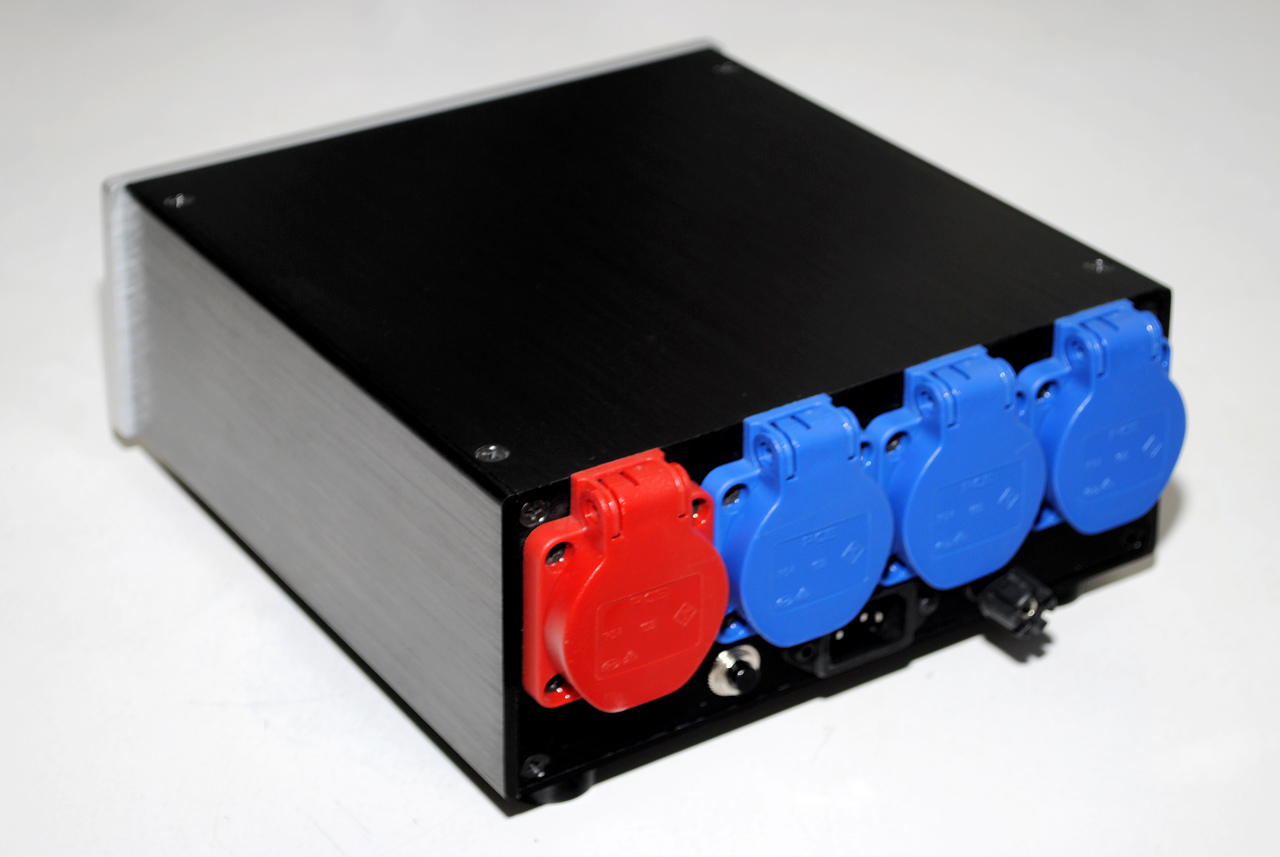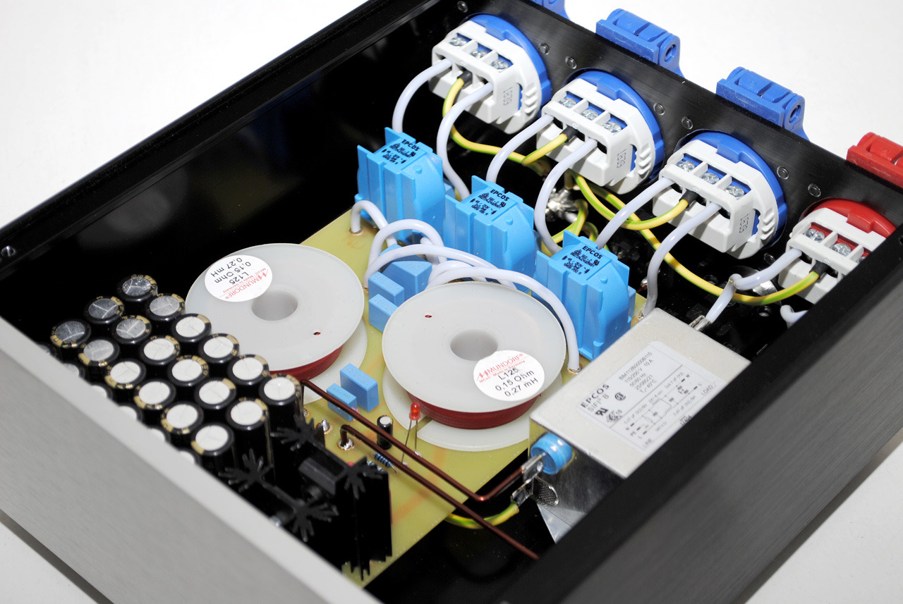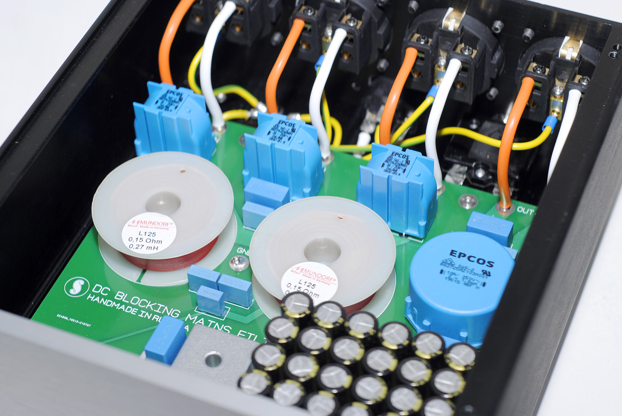 Изготовлена обновлённая версия фильтра. Сетевой фильтр-распределитель на 3+1 розетку. Три розетки для слаботочных (до 2А) потребителей и одна под сильноточный (до 10А). Встроенный фильтр постоянной составляющей сети. Каждый потребитель имеет свой независимый фильтр. Разводка земли “звездой”. Собран на комплектующих следующих производителей: Mundorf, EPCOS, Panasonic. кабель внутренней разводки - Canare 4 мм2. Стоимость 35000 руб.