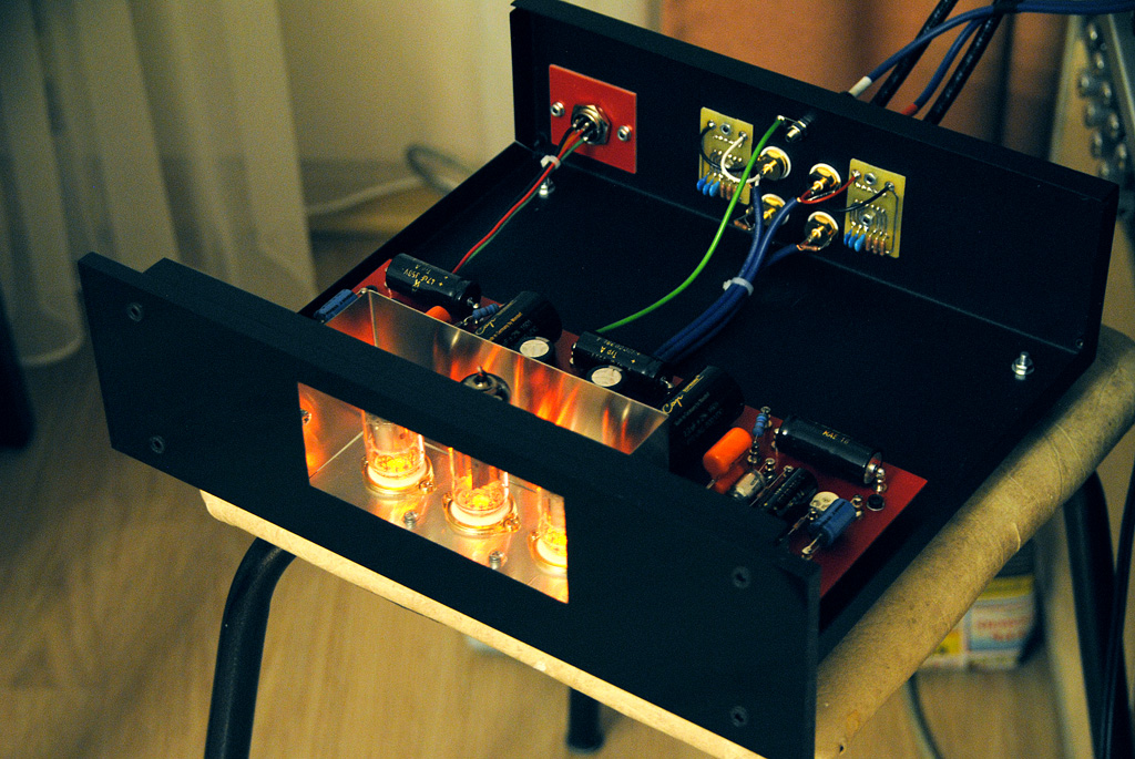 Некоторое время назад был изготовлен двухблочный корректор с полуоткрытым дизайном. Лампы были установлены за стеклом передней панели и подсвечены зелёными светодиодами (а-ля Макинтош). Сейчас завершаю похожий корректор, но уже с более естественной оранжевой подсветкой ламп.