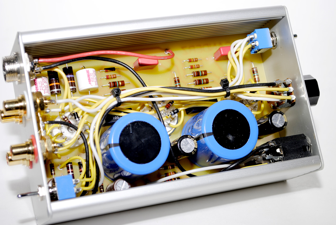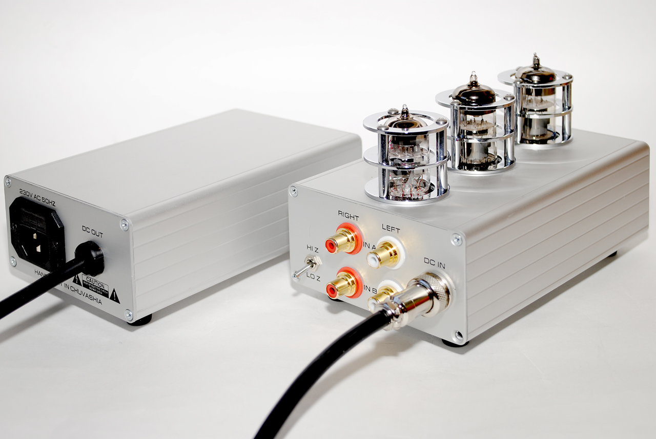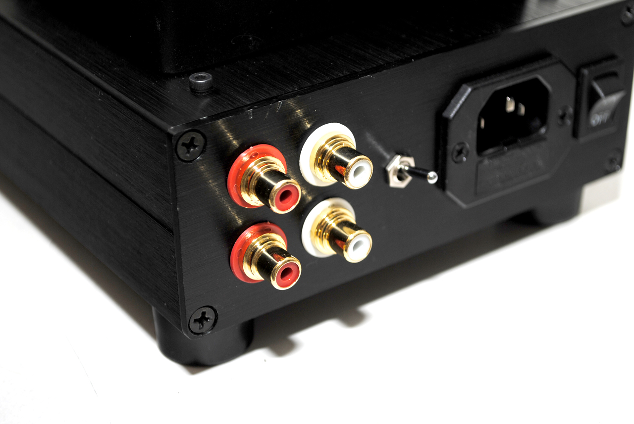 Данный экземпляр имеет два входа, два параллельных выхода (3.5мм и 6.3мм) и переключатель импеданса наушников (LO для 32-100 Ом и HI для 300-600 Ом).