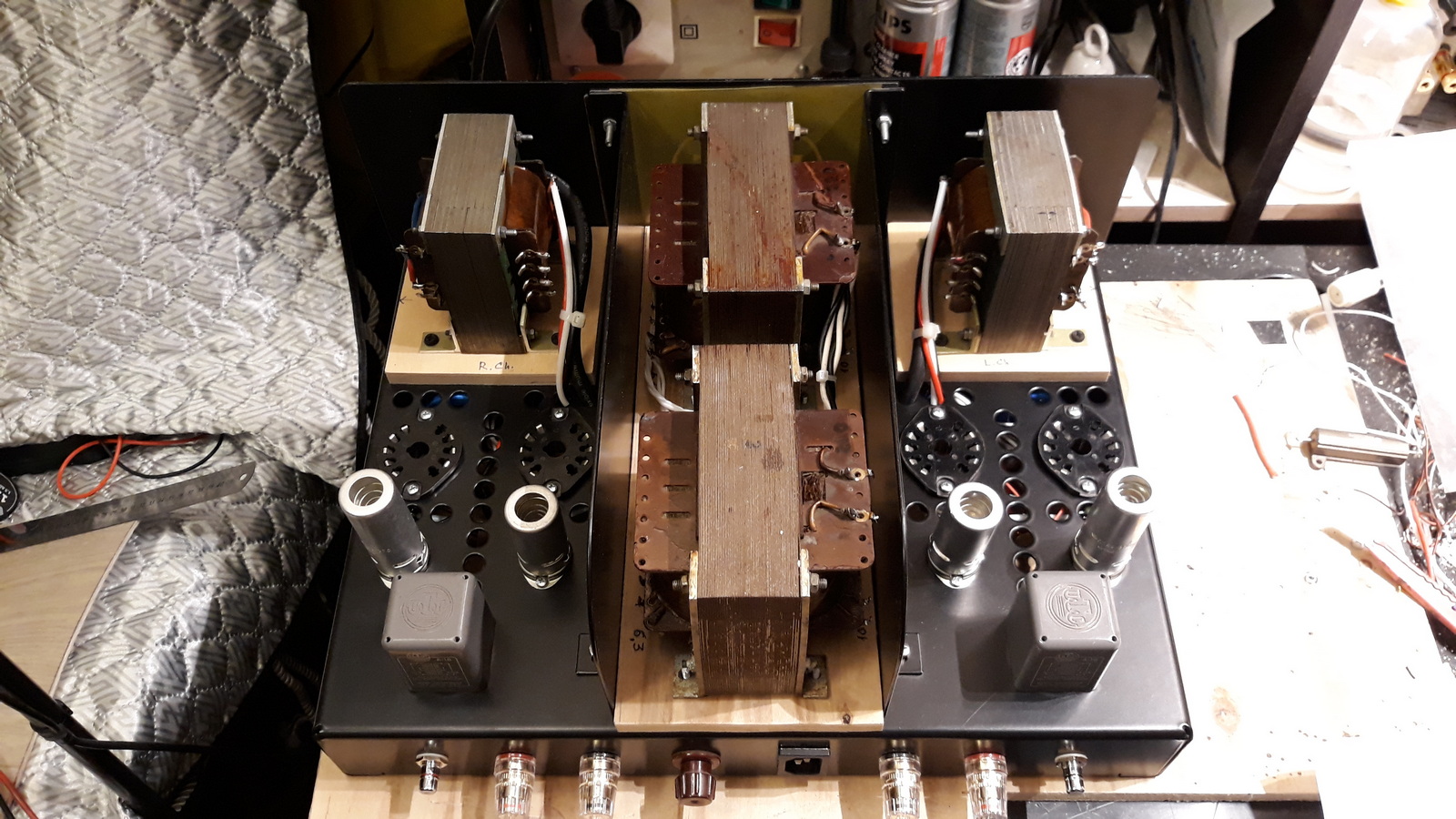 )...За колонкой обнаружил железный корпус от разобранного проекта...квартет NOS NIB EL-12 Telefunken , подмел пол-резисторы Ален Бредли, ельны, ничиконы, альпс ну и мелочевка всякая. две недели по 2-3 часа вечерил и вот такой монстрик получился...