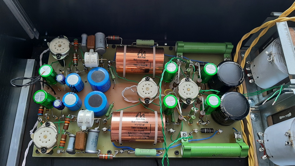 Схема Аббаса с максимальной комплектухой...резисторы АБ...Кивам...ВС...кондюки ВС...филипс...блек гейты...ничикон мьюз..мундорф...аудионот...в коррекции наша слюда...транс АН заказной на пониженную индукцию в Аудиоальт...разъемы аудионот серебро...провода ксло...кимбер... лампы сименс,муллард,сильвания.