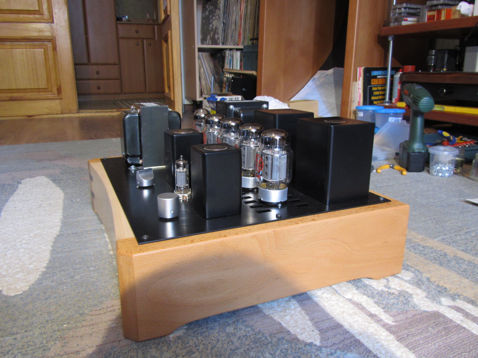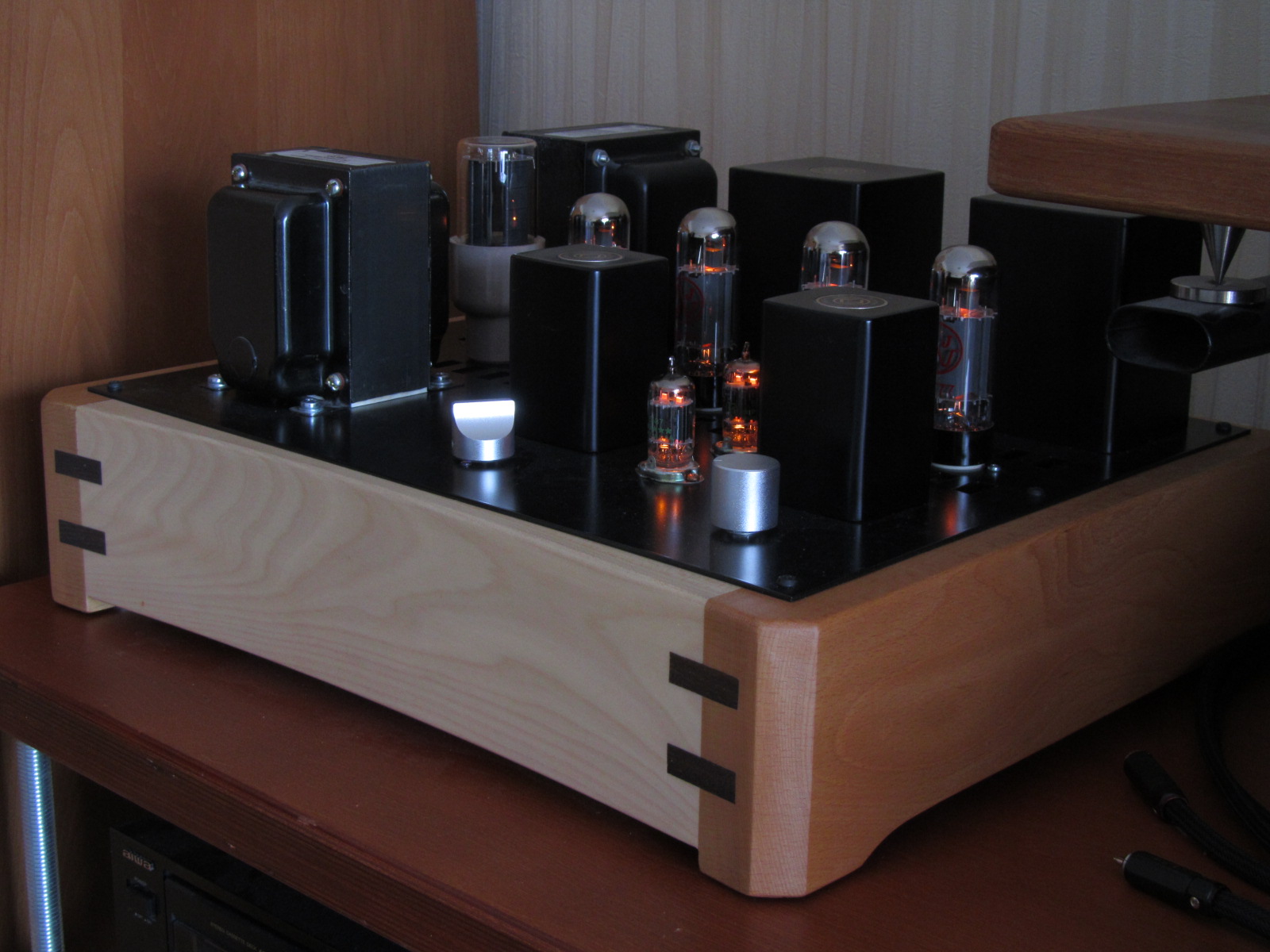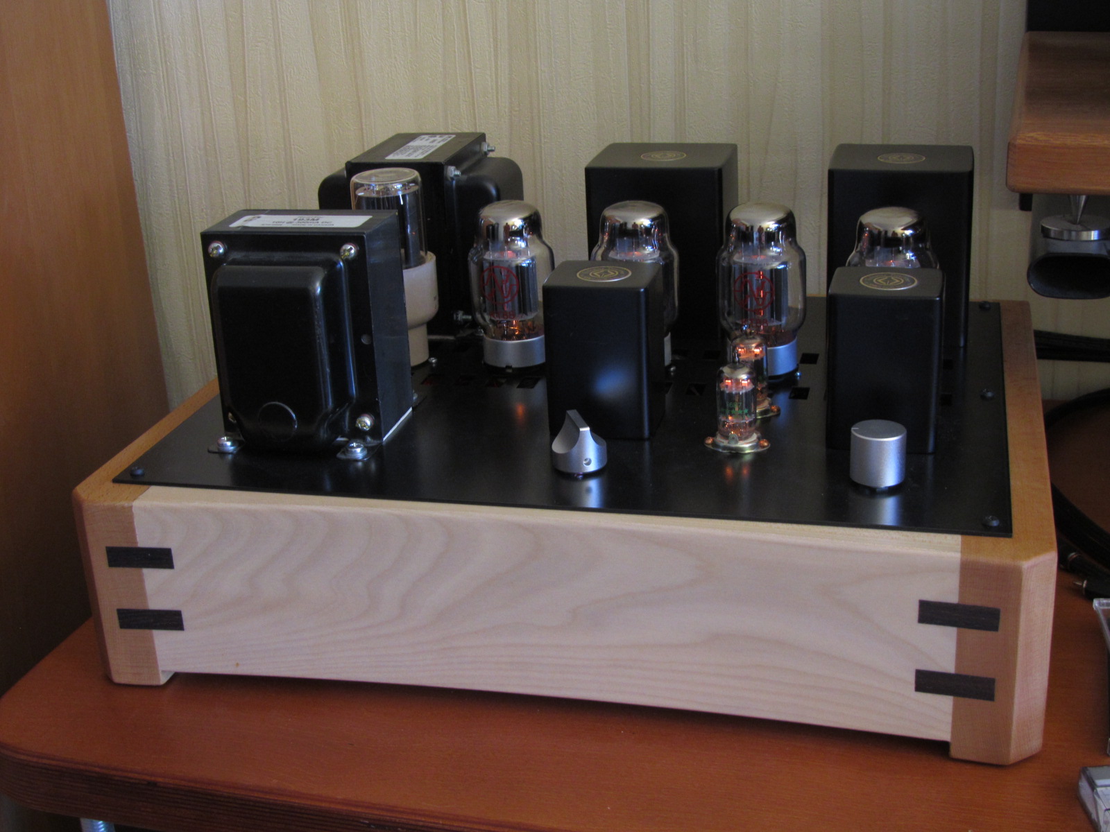 http://www.tubeampdoctor.com ), на драйвер и входной каскад решил поставить шикарные 5687 фирмы GE, кенотрон 5R4WGA фирмы Chatham Electronics. Решил сделать интегральник...три входа будет достаточно, РГ ALPS, резисторы DALE, AB, Kiwame, наши уголек ВС, кондеры Nichicon, WIMA, Elit, провода медь...Корпус усилителя изготовлен из массива бука и явора со вставками из черного дерева,покрытого бесцветным лаком, верхняя и задняя панели из железа, покрытого порошковой краской. Чуйка получилась 150 мв, выходная мощность по 15 ватт на канал, частотка 8-35000 гц на 1 ватте, потребляемая мощность с лампами КТ-77 около 120 ватт, вес 25 кг, размеры 50-44-23 см...Реальная схема с режимами работы прилагается...Чем хороши пушпульники-работают хорошо почти с любыми колонками и играют почти любую музыку...