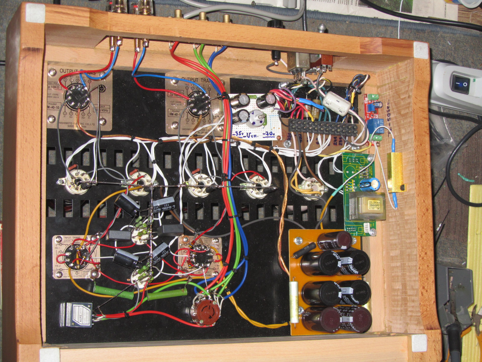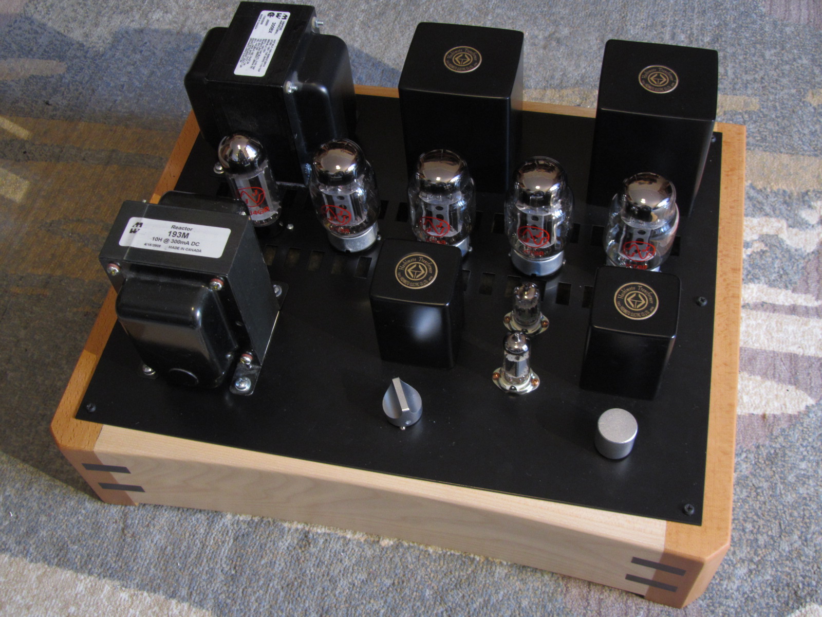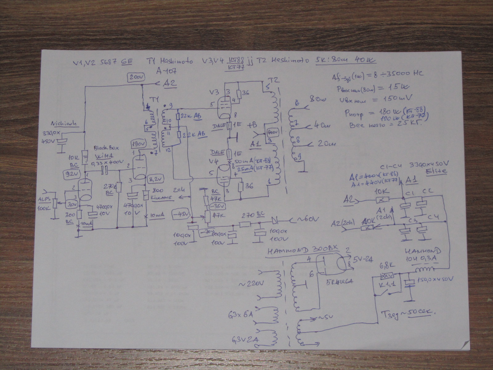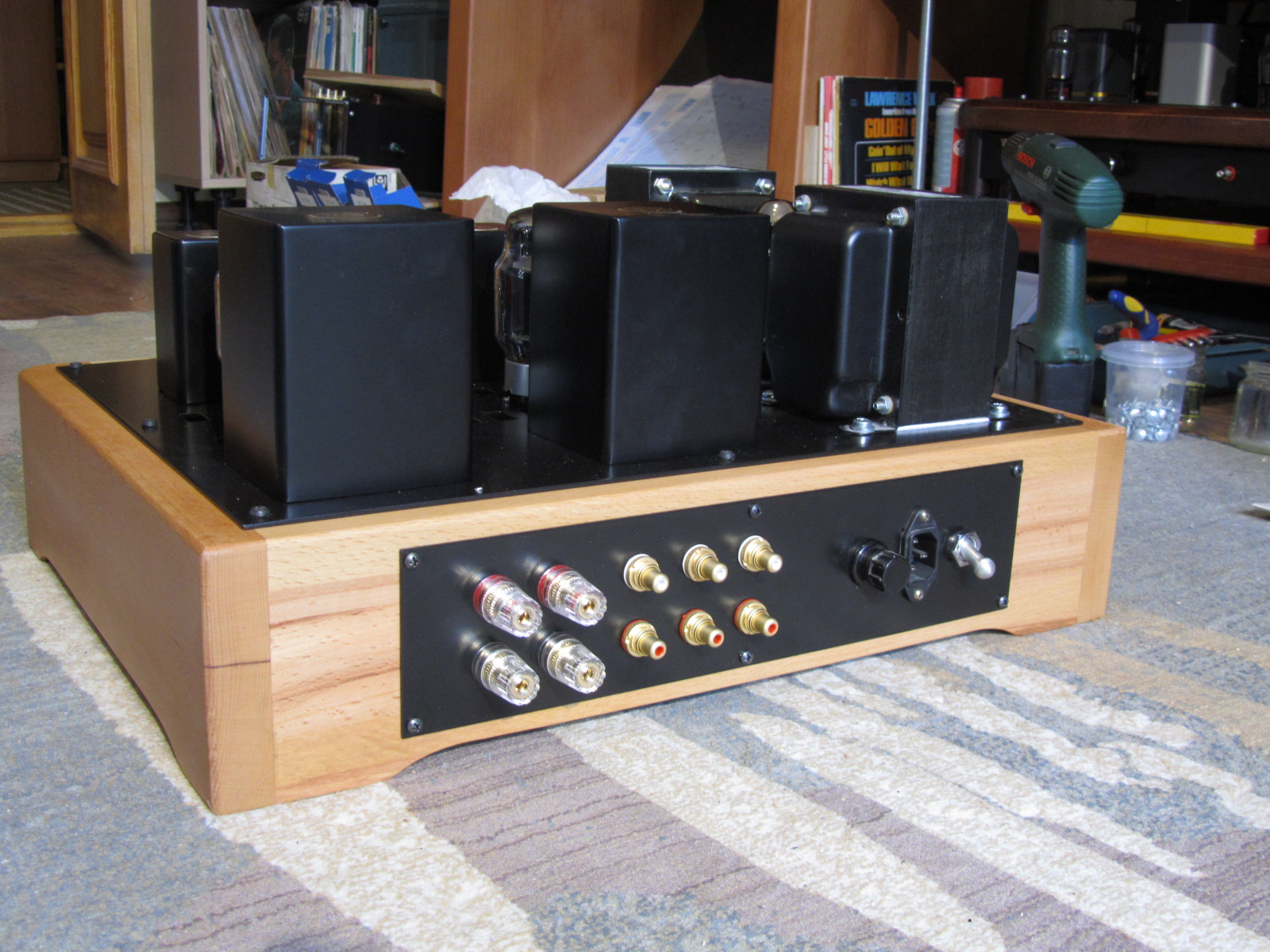 http://www.tubeampdoctor.com ), на драйвер и входной каскад решил поставить шикарные 5687 фирмы GE, кенотрон 5R4WGA фирмы Chatham Electronics. Решил сделать интегральник...три входа будет достаточно, РГ ALPS, резисторы DALE, AB, Kiwame, наши уголек ВС, кондеры Nichicon, WIMA, Elit, провода медь...Корпус усилителя изготовлен из массива бука и явора со вставками из черного дерева,покрытого бесцветным лаком, верхняя и задняя панели из железа, покрытого порошковой краской. Чуйка получилась 150 мв, выходная мощность по 15 ватт на канал, частотка 8-35000 гц на 1 ватте, потребляемая мощность с лампами КТ-77 около 120 ватт, вес 25 кг, размеры 50-44-23 см...Реальная схема с режимами работы прилагается...Чем хороши пушпульники-работают хорошо почти с любыми колонками и играют почти любую музыку...