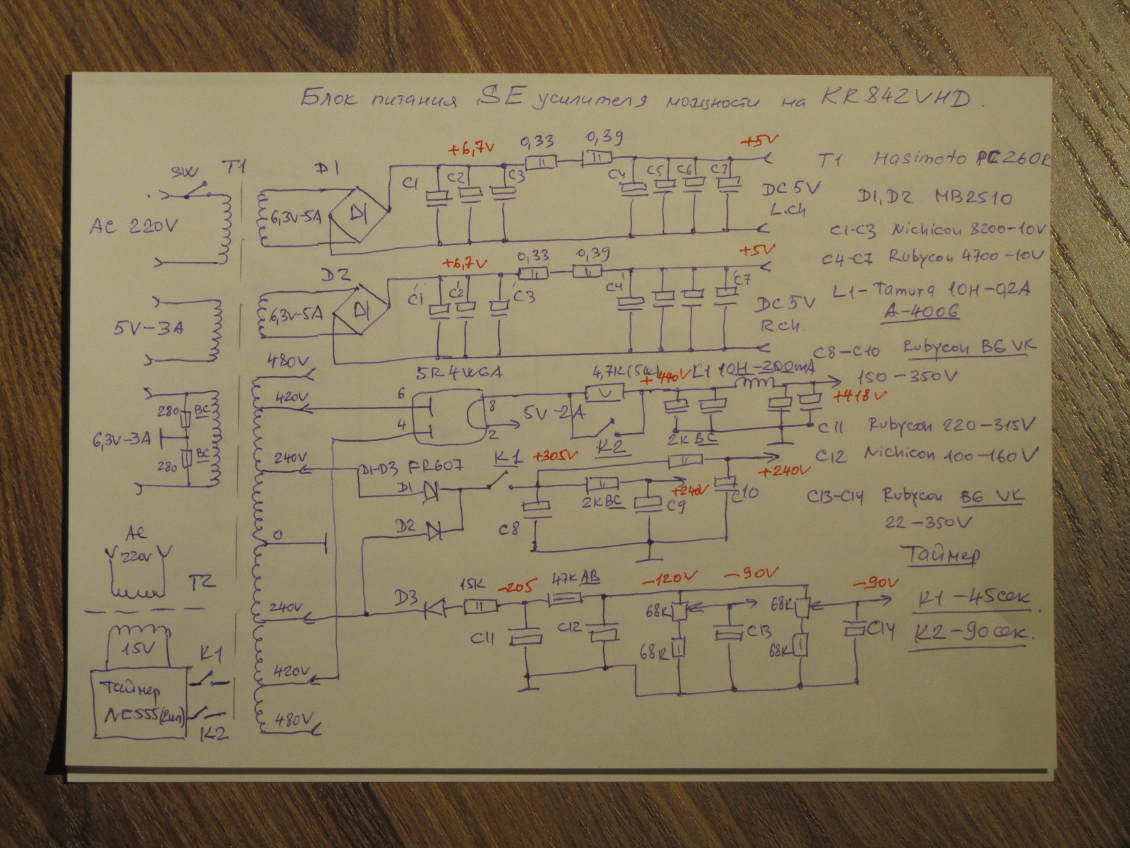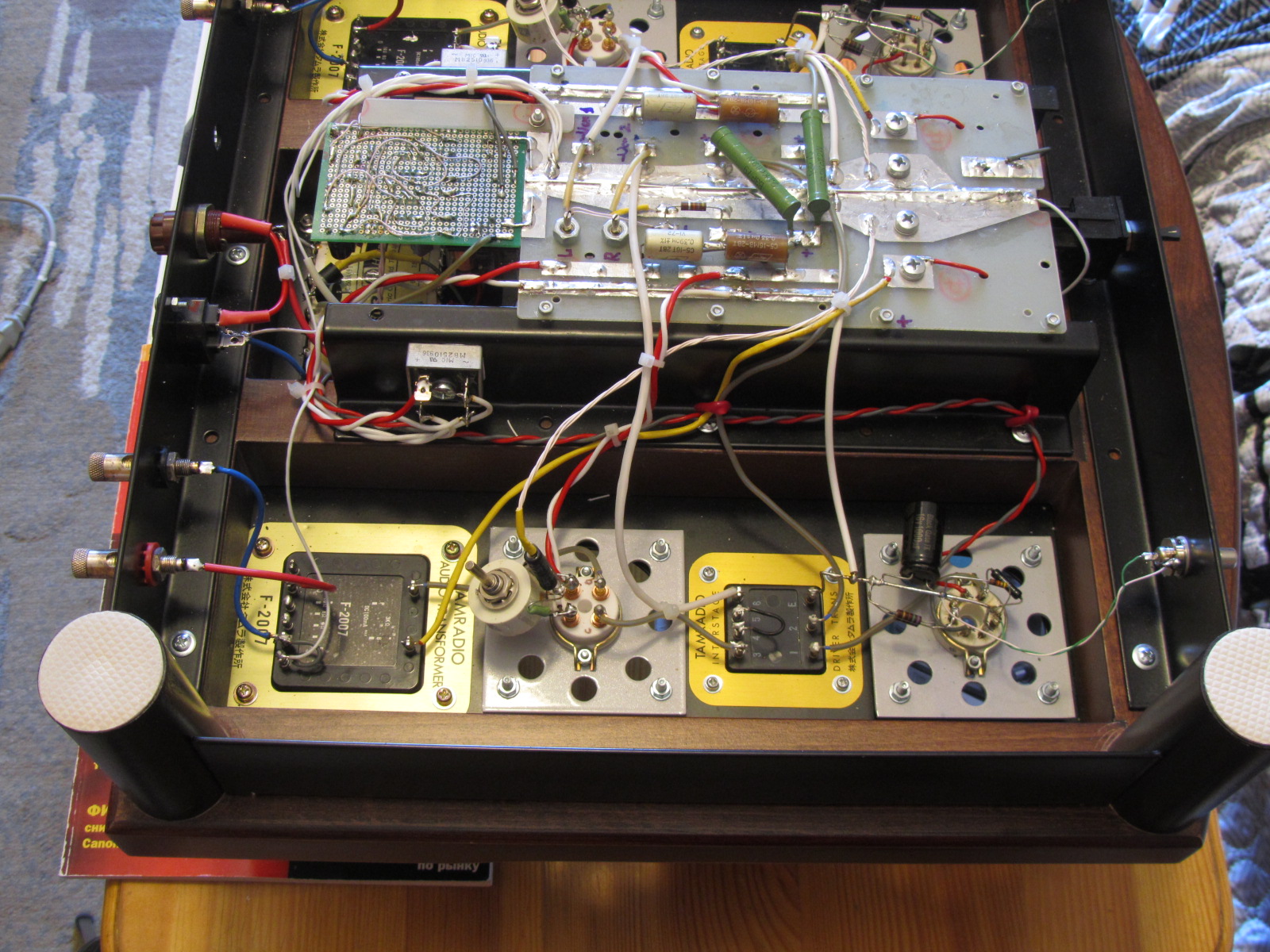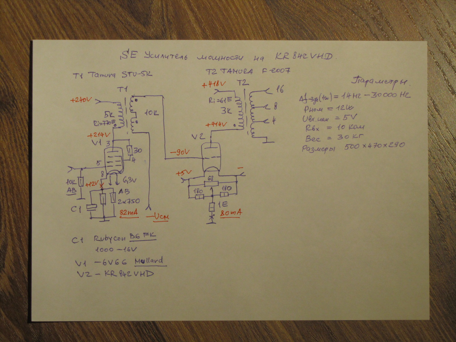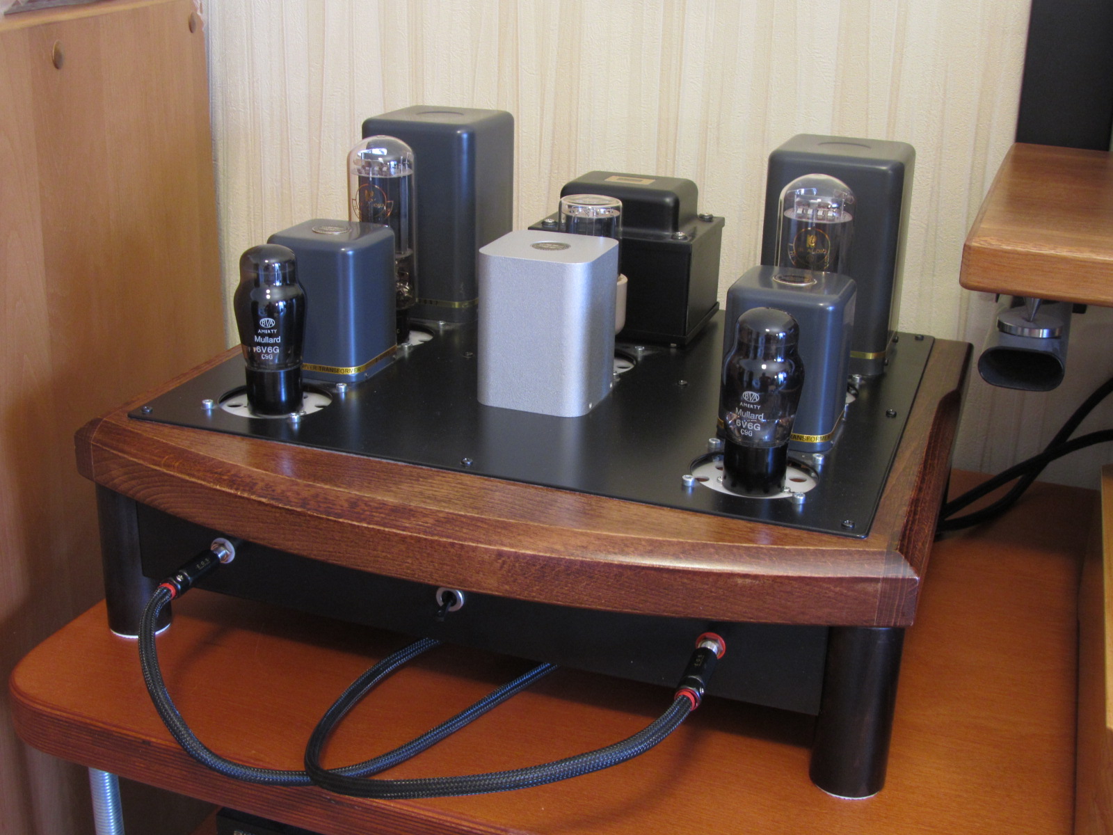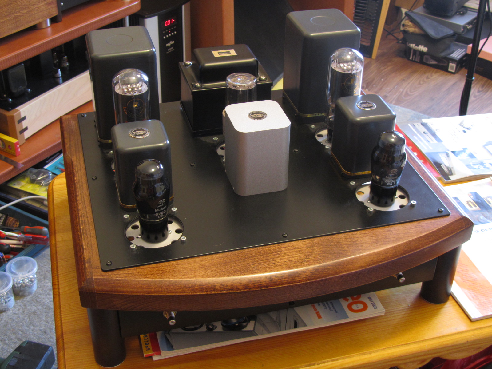 Шасси из массива бука 40 мм,Саша удачно на мой взгляд подобрал винтажный колор,Драйвера 6V6G Mullard в триоде конечно,у меня 6 пар 6V6 разных производителей и годов выпуска!Просто шикарная лампа!На выходе замечательная KR 842 VHD, как 300В,только мощнее,до 65 ватт на аноде...