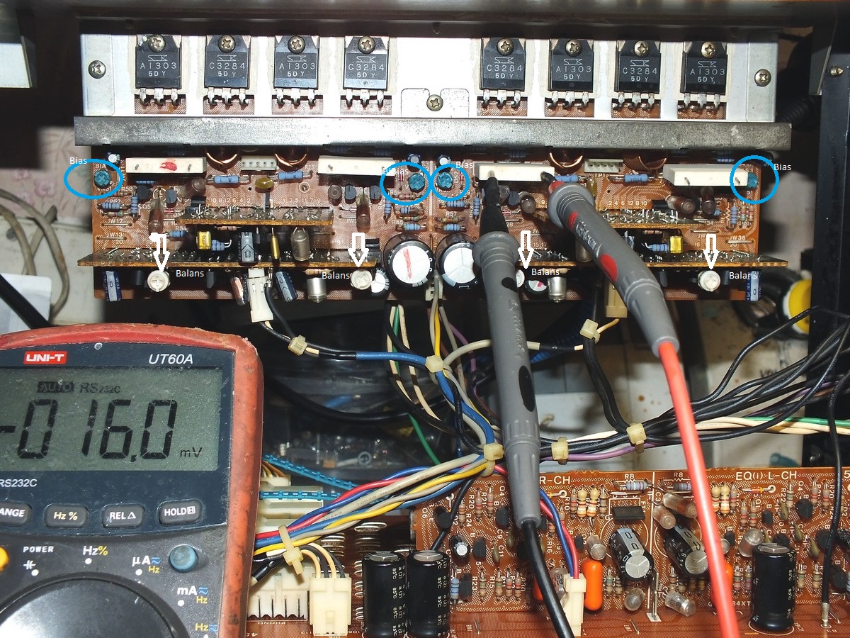 Aureal Подстрочники Bias и Balans не много оборотные и не герметичные поэтому подвержены окислению итд.. в общем со временем уходят режимы в том числе и по их вине. А еще есть идиоты даунтвиккеры что лезут с отвертками туда куда лазать не следует! Поэтому все режимы в таких УНЧ а схемка там критична к раз балансу плеч сбиваются что сразу сказывается в лучшем случае на ухудшении звука в худшем до полной неработоспособности . В этом экземпляре подстроечники Bias были заменены на много оборотные а Balans промыты химией.