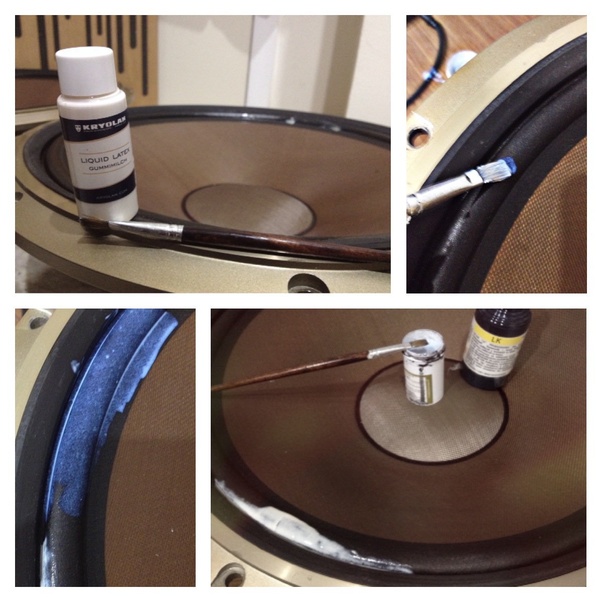 4. Оставляем динамики сохнуть 8-10 часов. Белый латекс на местах разрывов превратится за это время в прочную пленку, которая будет удерживать порванные края и предотвращать расползание ткани. Потом эту защиту нужно будет удалить.