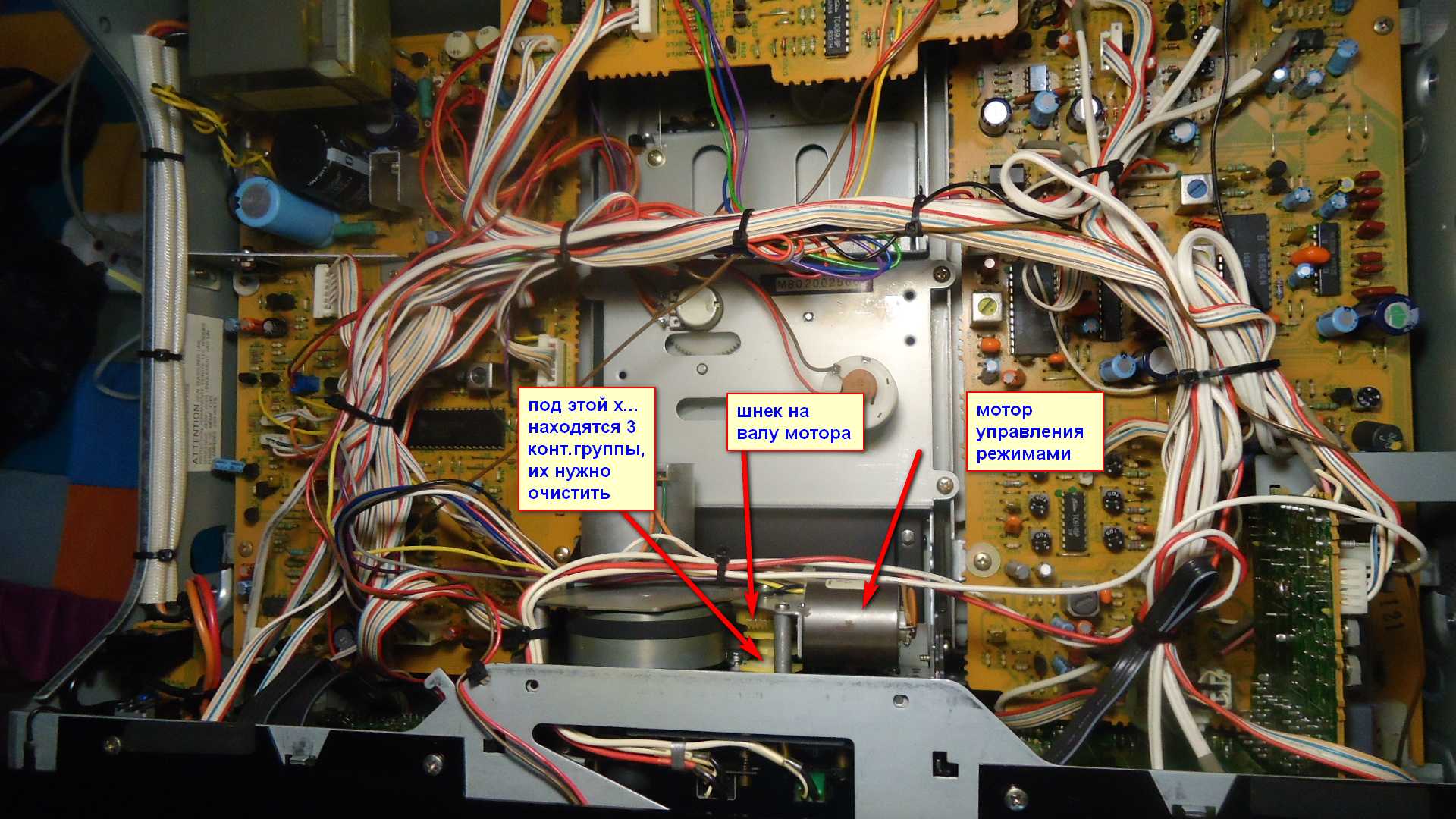 Примерно месяцев 5 назад я его отправлял специалисту в Питер (с головой и паяльником).В результате,через неделю началась опять такая же ерунда.Включаешь,работает.Причём всё работает,как положено.Через какое то время нажимаю кнопку воспроизведения,не включается.Снимаю крышку,даю моторчику щелбана,всё начинает работать.Написал специалисту (с головой и паяльником) Он мне прислал фото с ответом.Вот тут находится контактные группы,их надо очистить.Я же тебе оплатил ремонт,столько сколько запросил.Вот так и надейся на порядочность мастеров.