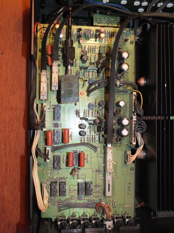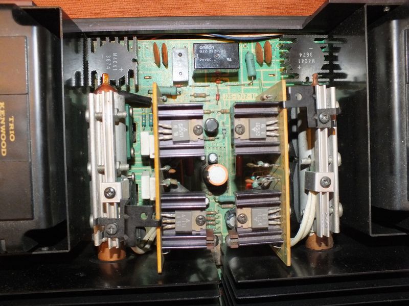Вся коммутация на реле от OMRON . Реле с герметичными контактами , внимание не менять! Через контакты проходит столь незначительный ток что и по прошествии стольких то лет им контактам не хрена не сделается. Единственное реле требующее внимание это реле включения АС . Внимание оно на 40V . Но и тут не все так плохо, японцы же не дураки а еще в 1979 году сделали так что бы контакты реле не входили в число тех вещей что "убивают" сигнал. Они сделали так что сигнал ОООС снимался с выходных клемм после контактов реле! Вы же спросите как так а как же цепь ООС она же будет разорвана при срабатывании защиты кстати на спец микрухе что следит за перегрузкой. Так вот значит японцы сказали хренушки Вам а не разрыв, и включили в цепь ОООС еще один контур на прецизионном реле что не дает разорваться петле. В общем вот так вот, не все мелочь по карманам тыреть. Тракт УМ не содержит различных электролитов на пути сигнала ,то есть усь УПТ. На счет схемотехники тут есть где разгуляться в описании но всего помаленьку. Человек что припер ко мне это чудо пожаловался что дескать греется правый канал аж страсть , регулятор громкости потрескивает. есть щелчок при включении уся но играет это штука просто феерично! Не откладывая дело в сторону тут же подключаю усь в место своего Pioneer к своим АС( 4 Ом ) и включаю Yello Touch. C первой ноты стало ясно что НЧ диапазона просто нет. Что то дрябло прошамкало в АС и попер вокал. Вокал надо сказать был более менее но в правом канале опять таки периодически что то лязгало. Я спросил как как так а у вас дорогой как оно играет ? Мне с гордостью сказали что феноменально с обычными АС, всего хватает и НЧ и ВЧ и вообще все отлично тока вот греется не по детски.