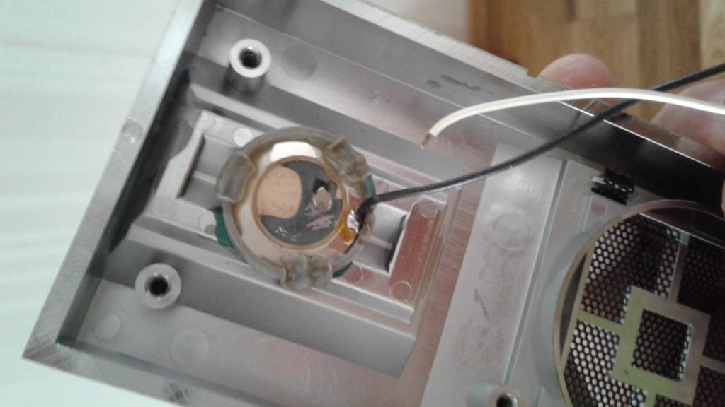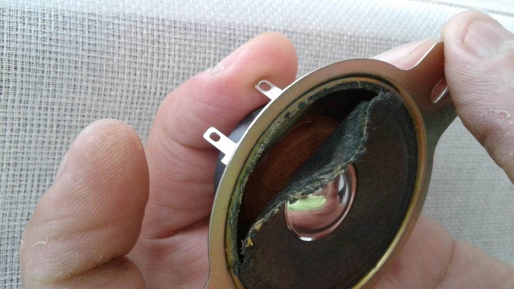 Начал с колонок. Побегав по чип-дипам и прочим лабазам я не нашел подобных пищалок. Уже думал поставить автомобильные купольники, но потом решил вскрыть пищалку. Под отклеенным краем диффузора обнаружил отломившийся подводящий провод. А может и на заводе не запаяли. Поставил протез в виде штырька, к нему и распаял подводящий. С внешней стороны лишнее откусил бокорезами. Динамик заработал. Подклеил край диффузора. Внешне может и не ах, но под решеткой не заметно, а функционал восстановлен. До кучи припаял оторвавшиеся проводники от пьезиков - пьезики заработали тоже. Осталось подклеить распорки и собрать АС