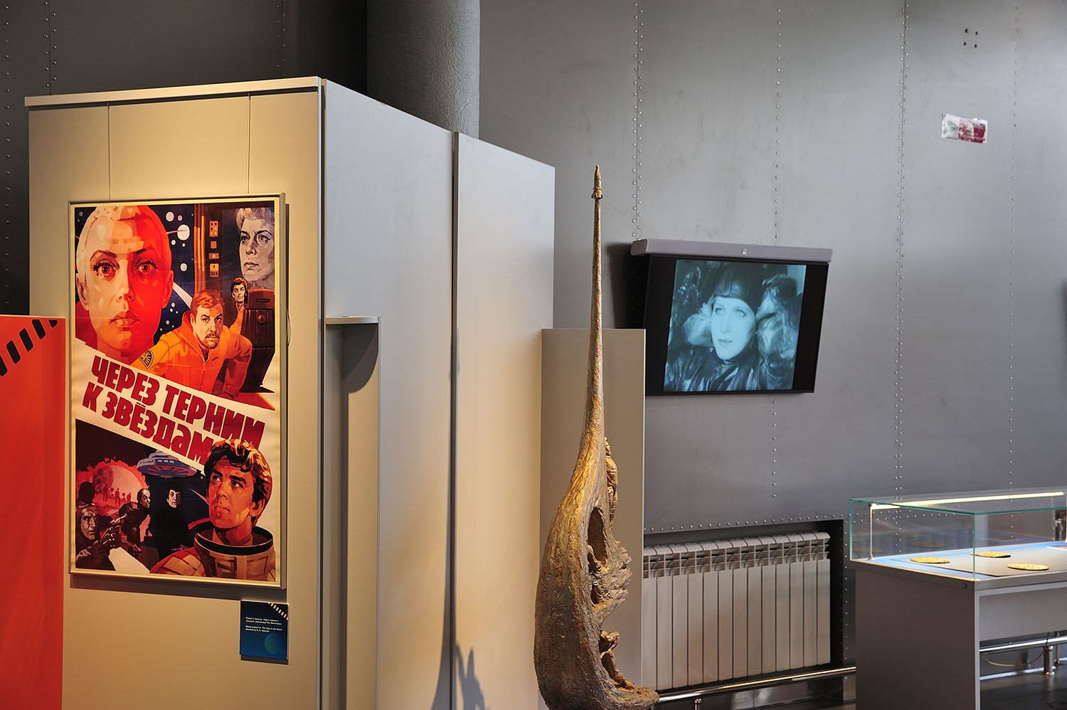 А вот афиша фильма "Через тернии к звездам". Сбоку - одноименная скульптурная композиция. На экранчике демонстрируется старый фильм "Аэлита".