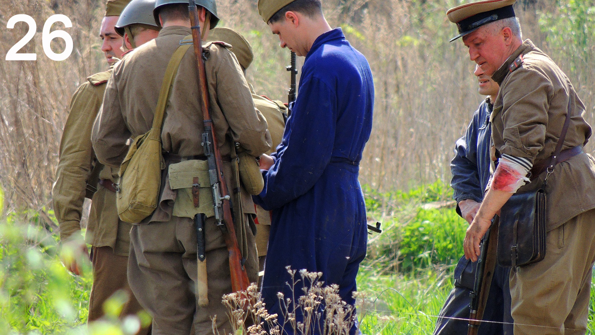 На фото 9 мы видим датского фашиста, любовно оглаживающего нашу трехлинейку. Да, сволочь, это тебе не Krag-Jørgensen, эта штука посильнее "Фауста" Гёте! На заднем плане пухлячок в штатском - фольксштурм, а командует всей этой 3,14здобратией аж целый эсесовский оберфюрер, котогрого мы видим справа.