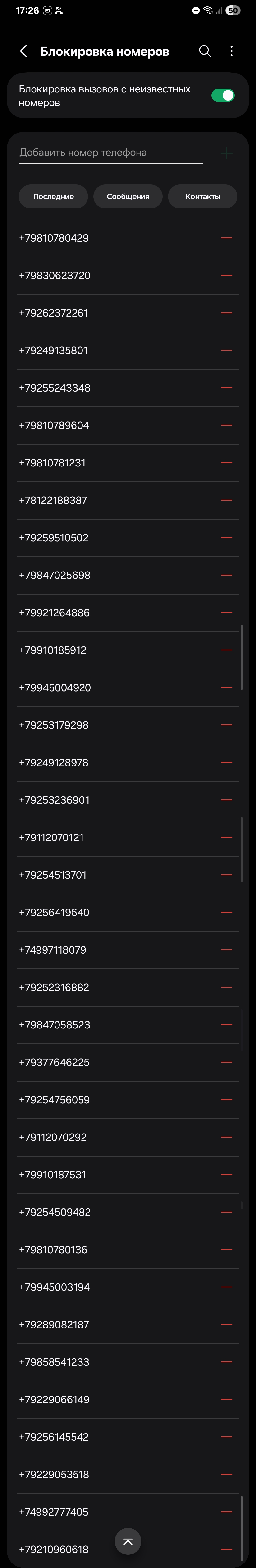 Второй день творится хрень. Ощущение, что кинули call bomber на мой номер телефона. Звонок пару секунд и отбой, через непродолжительное время снова. В ручном режиме блочил, но потом надоело и поставил режим "не беспокоить" с разрешением на звонки только из телефонной книги. Вот так выглядит мой блок лист на сегодня