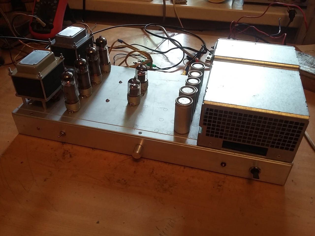 В качестве CR1 и CR2 - КП103Е и Ж с подобранными резисторами в истоках (естессно, "кверху ногами"), в качестве T12 и 13 в одном из каналов 2SC3320 из коньтуперной питалки, T7 и 8 попросту КТ851А (до сих пор не могу понять, откуда они у меня взялись), T1 - КТ3107Б, T3 - КТ3102В, правда, с приёмкой, T2, 5 и 6 - 2N5401\5551 с олебобов (правда, Uк-э макс. я им проверял. Причём вышло под 180 Вольт), операционники - LF355 из пульта ылегктронякапыэмнультри, совершенно пофигу, главное - полевой вход, там и КР!544УД1 великолепно будут работать.