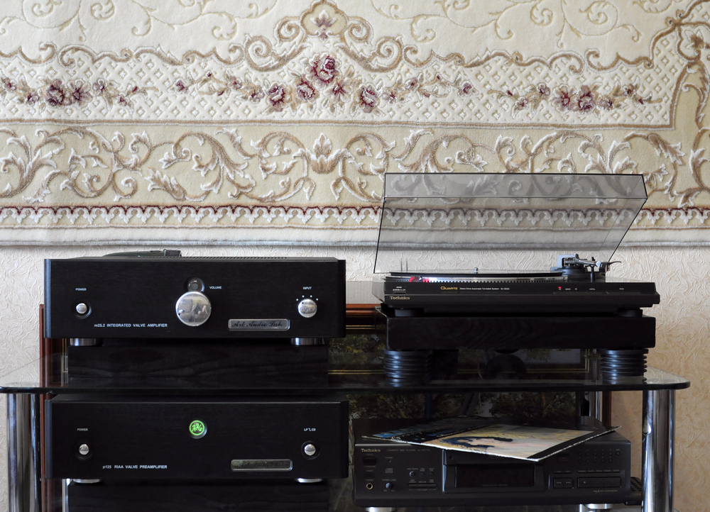 Вертак, через самодельный переходник, подключен нормальным кабелем, который запитан от кондиционера сети Belkin Pure AV PF-30. Межблок к корректору - Ultralink. Два провода тонарма: коричневый (акустический Ультралинк) - впаяный. Красный - древняя советская моножила, вставлен в штатный разъём. Можно отсоединить от корректора один и подключить другой для разнообразия. С каждым из них звучит немного по-другому.