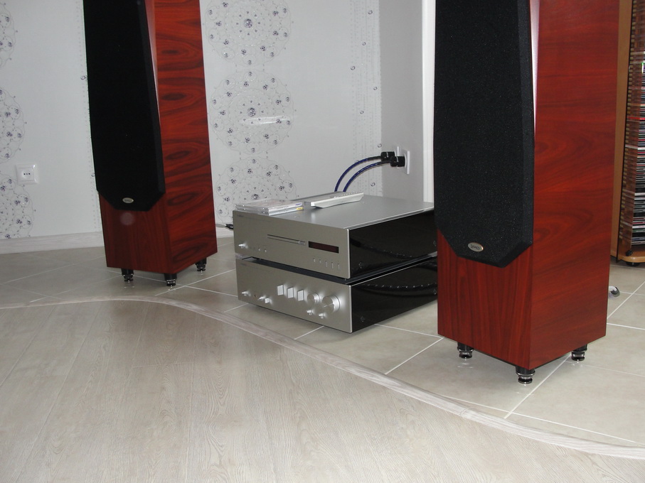 А вы положили тоненькие плиты по полсантиметра - оригинально, все это чешуя, с таким же успехом можно было ставить акустику на голую стяжку. Ложили бы тогда сразу ламинат на всю комнату и не заморачивались с плиткой, тем более непонятно, зачем ее вести вдоль стены и портить звук. Короче напоминает кухонный дизайн.