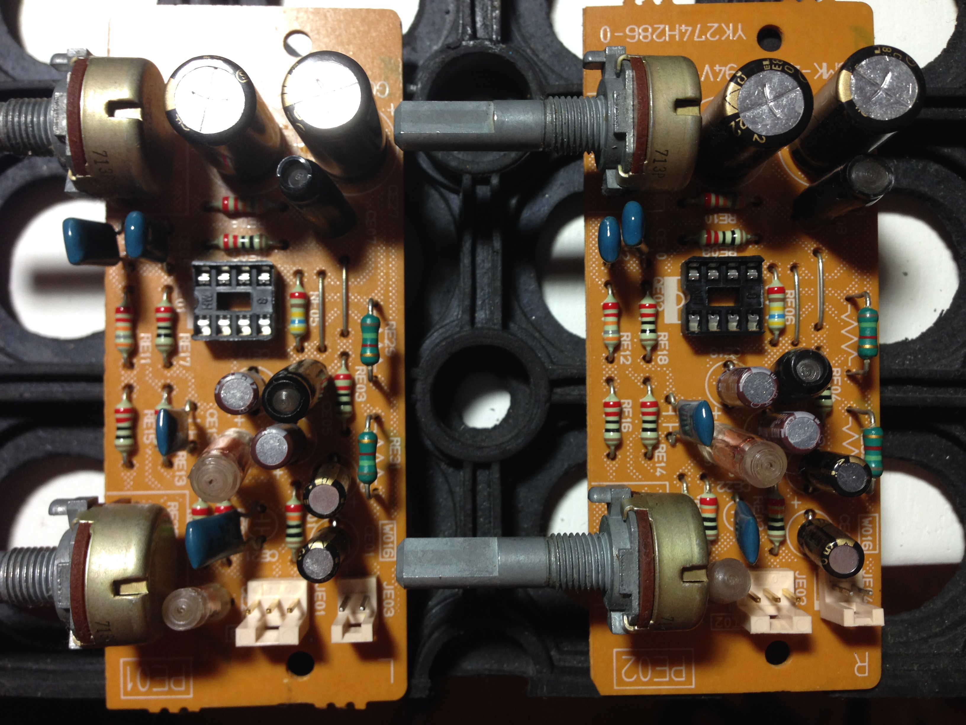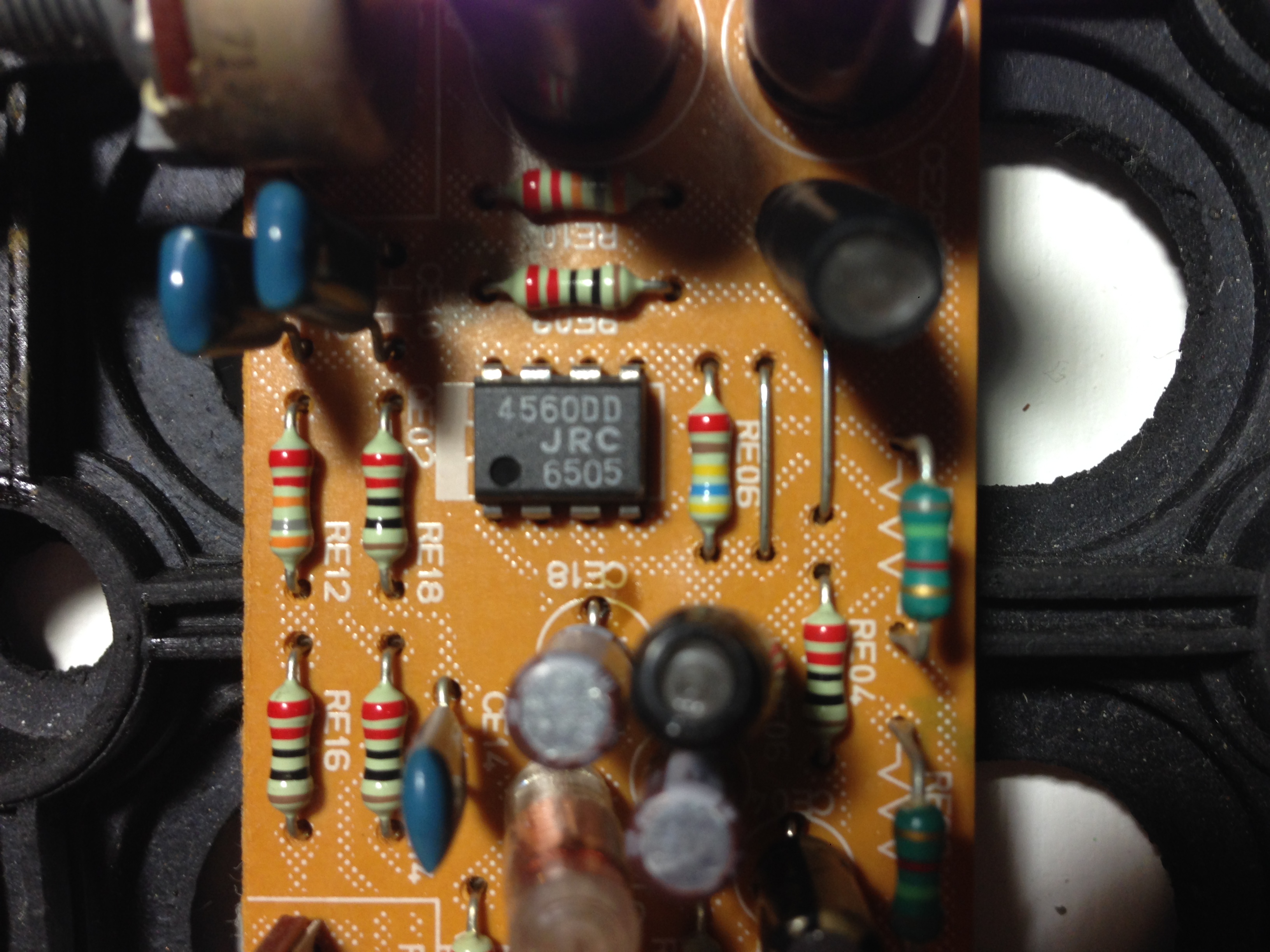 Итак, обо всем по порядку. Кулера порядком насосали пыли, являлись потенциальным источником помех, хотя и тихо работали, были демонтированы. Соответственно их блок питания тоже. Все платы были сняты, промыты и прочищены от пыли, местами заводские разъемы пришлось пропаять, куда не заглядывал в прошлый раз. За тонкомпенсацию отвечают узлы на основе ОУ JRC 4560D. Прежде чем что то делать в обвязке, вначале заменил сами ОУ. Поразмыслив, поставил OPA 2134, на панельки, чтобы быстро поменять (или вернуть обратно), если что то не устроит. Пайки, естественно, специальным припоем Johnson, содержащим серебро и медь.