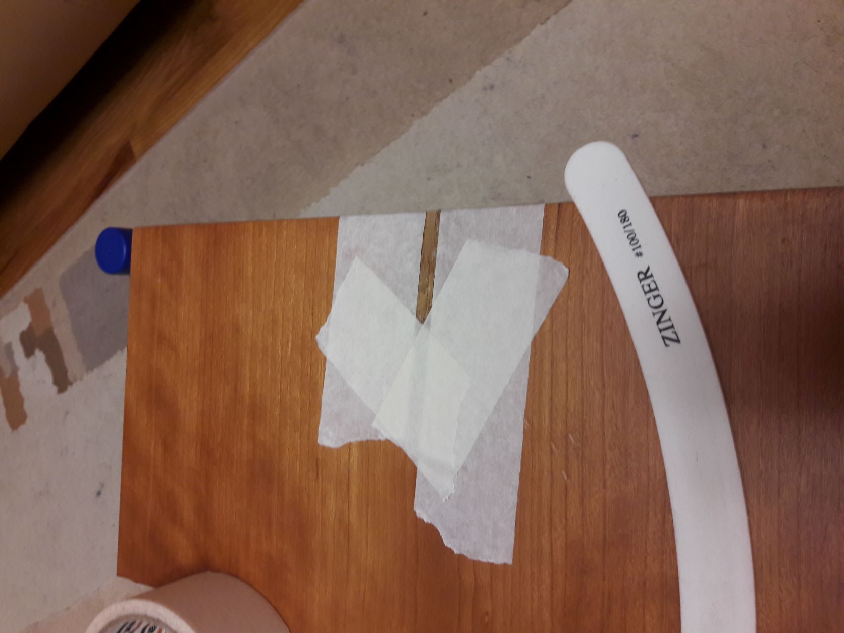 Выходные продолжаются Решил заделать сколы и отщепы. Начал с этого Вложение: Нашел дома кусочек шпона, правда не совсем подходящий, но для понимания намазал его йодом и вроде более менее подошел по цвету. Опилил его в габариты скола Вложение: Клеил на столярный ПВА с утюгом (100град), через крафт-бумагу Вложение: Вложение: Вложение: Приклеил, обрезал, буду зашкуривать. Хорошо подходят для мелких деталей пилки для ногтей. Взял без спросу у жены