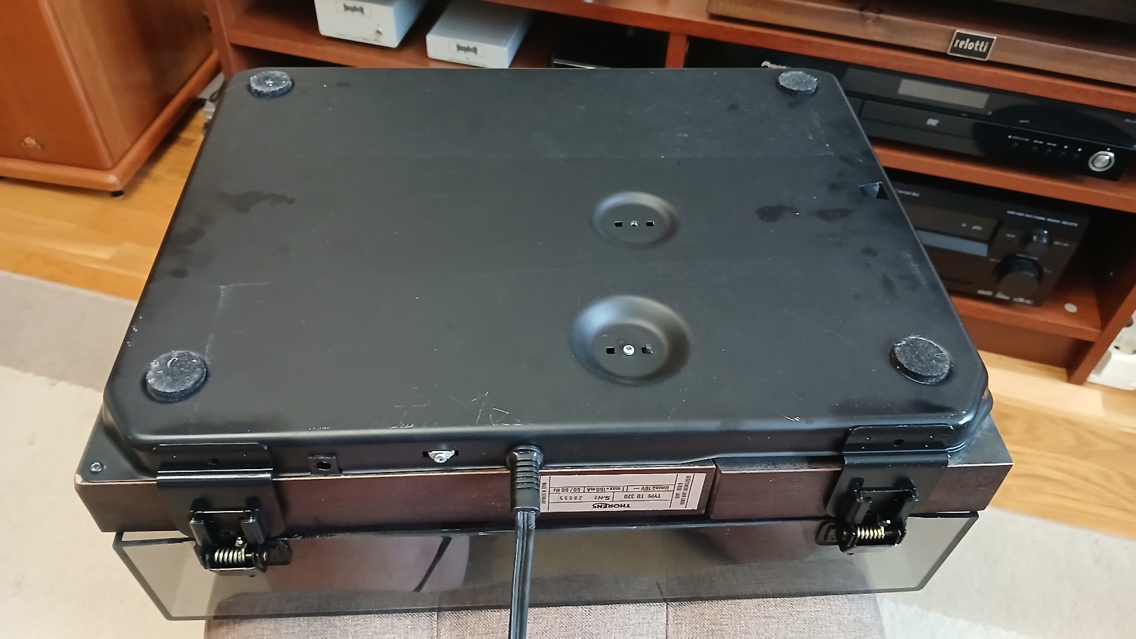 Стоимость устройств была плюс-минус сопоставима. Торенс немного дороже, около 750 дойчмарок в 1986 году. Внешний вид, конечно, у японца более презентабельный. Лакированная ламинатом под дерево баржа солидных габаритов, большой опорный диск, выступающий за габариты пластинки, тонарм как из хирургического отделения - нержавеющая сталь. Торенс крайне скромен - габариты по ширине укладываются в стандартные 45 см, шпонирован (как выяснилось) красным деревом, но не лакирован до блеска, тонарм внешне - нескладное недоразумение из прошлого, диск в размер пластинки, управление архаичное - ручками из 1968-го года, всех украшений - алюминиевая полоска на панели. Но вот петли на Трио пластик и это задница. Их выламывает со временем. Тор имеет стальные
