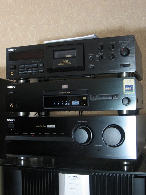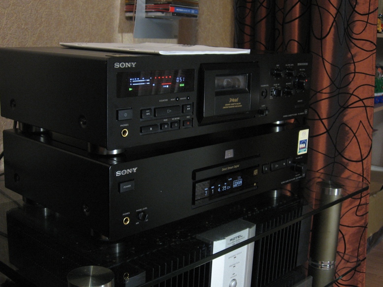 Попала недавно мне в руки вот такая интересная система: кассетная дека SОNY ТС-КВ920S, SACD-CD проигрыватель Sony SСD-ХВ940, усилитель TA-FВ940R. комплект вроде и не винтажный вовсе, начало 2000х, на селекторе усилителя есть опция "SACD', но вид у компонентов типичный конца 80-х начала 90-х годов. Ну и состояние как из магазина сразу выдает новодельное происхождение. У всех блоков массивные железные фасады, сразу внушает уважение. Дизайн лаконичен, я бы даже сказал скромноват. Больше всего меня интересовал SACD проигрыватель. Собственно говоря, из-за него комплект и покупался, владелец отдельно не продавал ни в какую, но меня это особо не расстроило - учитывая его цену. Я легко могу продать усилитель с декой за те деньги за которые купил весь комплект, и еще на отметить останется. Итак, включаем SACD (а у меня есть 2 SACD, именно магазинных, заводских дисков из Медиамаркта). Включил проигрыватель в свой тракт. Звучание SACD сразу напомнило хайрез 24/192, такое-же экстремально детальное и растворяющее звук на мельчайшие инградиенты. В общем, от SACD я примерно этого и ожидал, но меня больше всего интересовало как он воспроизводит обычные СD, обладая превосходным 24 битным ЦАПом именно для СD - я читал где-то что у аппарата 2 совершенно независимых тракта для SACD и CD. Что сказать - ожидания оправдались по полной - он звучал в точности как японский новодельный Denon 1500AE с 32 битным преобразованием который сейчас сейчас стоит в Медиамаркте 35 тыщ. В общем, аппарат не разочаровал, а скорее впечатлил. К тому же сделан в Японии. Усилитель был следующим в тесте. Подключил к Дали, и к этому SACD - первое что заметил сразу - полезла масса какой-то избыточной информации в СЧ-ВЧ области, но уши довольно быстро привыкли и начали различать детали. Звучание в общем весьма неплохое, высокое разрешение, усил разрабатывался специально для хайреза, и видимо особенности реализации делают свое дело - в аппарате применен максимально короткий тракт с системой Linear Phase Circuit я так понял эта фича исключает влияние темброблока на фазу. В директе наблюдается недостаток амплитуды крайних диапазонов - сразу вспоминается Хитачи с ее убедительным низом даже когда все улучшайзеры отключены. Я раньше тестировал несколько Сони, я бы не сказал что они все имеют общие черты в звучании, они все были абсолютно разные - не существует концепций звучания производителей, по крайней мере я в это давно не верю. У усилка явно новодельное исполнение - это хорошо видно сквозь решетку - красивые такие резные радиаторы, тороидальник, минимум деталюшек. Под крышкой спереди скрывается управление темброблоком, АС, еще дофига чем - я наивно понадеялся на тонкомпенсацию и 10 дб на НЧ регуляторе - он выдает в общем-то неплохой низ, но до Хитачи ему далеко. Вообще оставляет положительное впечатление, но сам я бы его вряд-ли использовал. Разрыва пред-мощник у него нет, зато клеммы позолочены. Здоровый, размером не меньше легендарных Пио 617-702 Ну про деку особо нечего сказать - она мне не нужна, выглядит конечно серьезно, сквозной канал, всякие калибровки, биасы, все долби на свете и т д, продам без сожаления).
