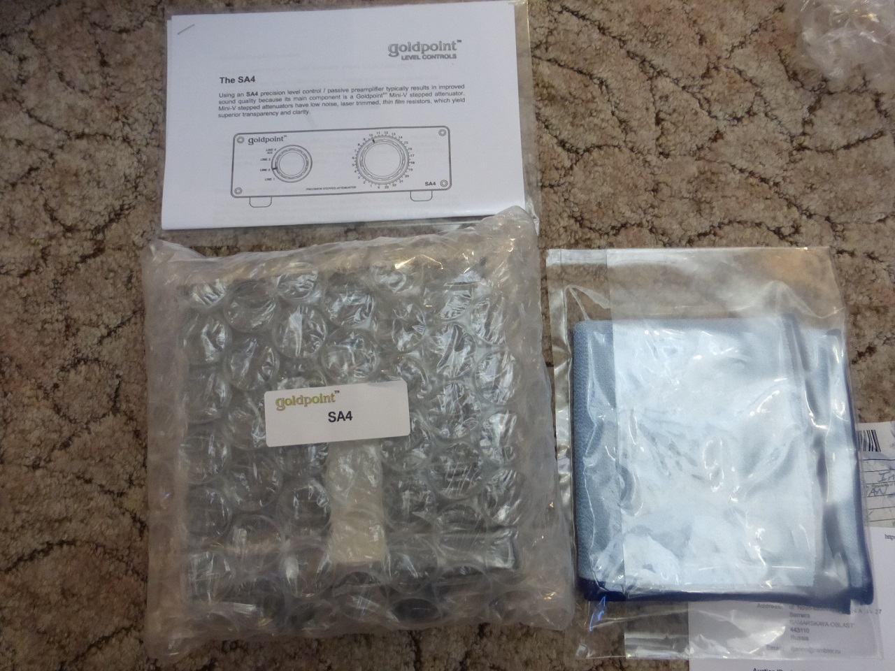 В моей системе, был некоторый минус.Активные предусилители у меня в наличии имеются.Ламповые конечно.А вот пассивого преда не было.А есть у меня два ламповых моноблока, имеющих достаточную чувствительность со входа.И высокое входное сопротивление.Так что ,для них активный предусилитель не требуется.Более того, активный предусилитель имея усилительный элемент,один каскад лампового усиления и нагрузку линейный трансформатор.Он всё одно ,вносит свою порцию искажений.И ограничения по полосе пропускания входного сигнала.Тут уж никуда не деться. А я как то, уже давно ,пробовал включить GOLDPOINT SA4 с дискретным регулятором громкости 25 ком ,вместо активного предусилителя и был доволен возросшим качеством звучания.И вот сегодня ко мне пришёл долгожданный GOLDPOIN SA4 из враждебного государства .... Причём, мне его принёс курьер прямо домой... Распаковал коробку.Фирмач, упаковал его на славу.Не забыл, даже положить тряпочку ,так же упакованную в полиэтиленовый пакет,для удаления пятен от пальцев на GOLDPOINTe