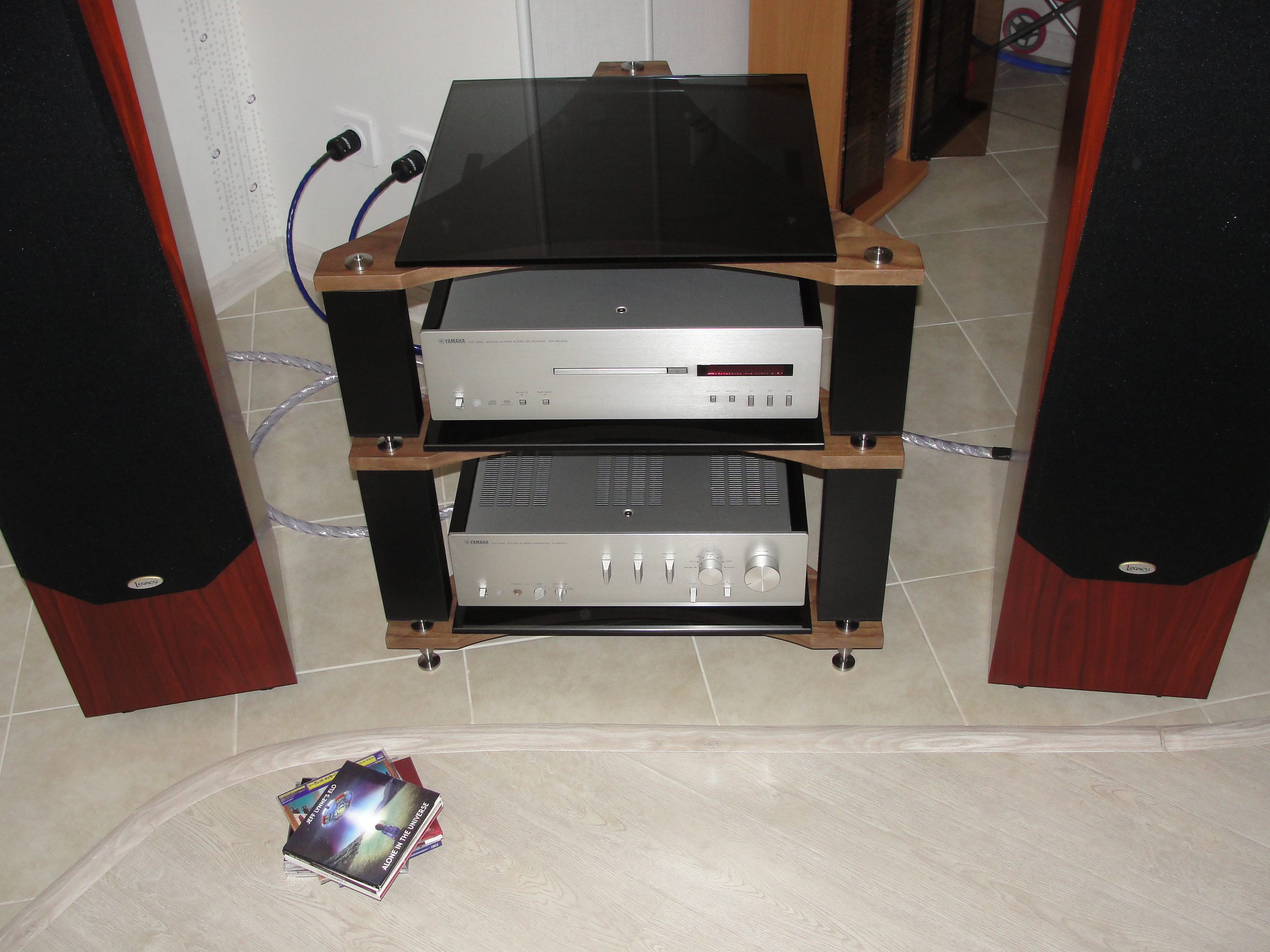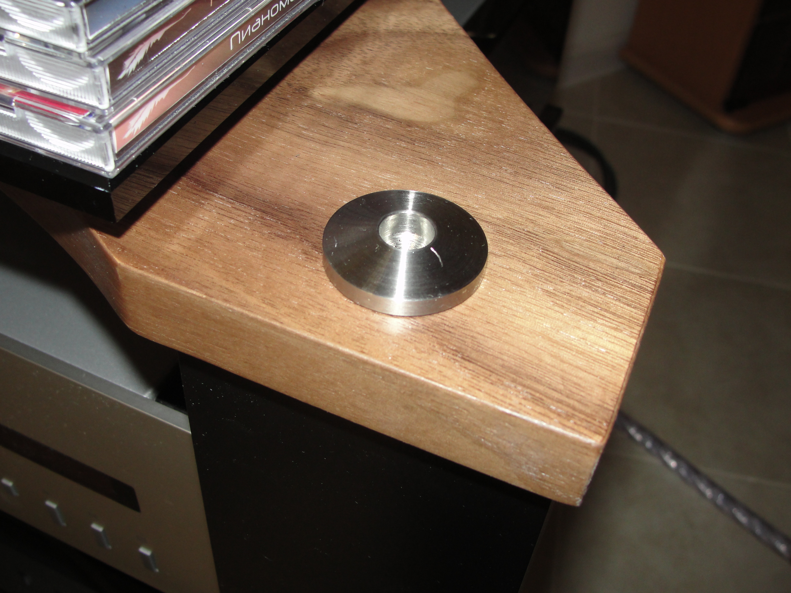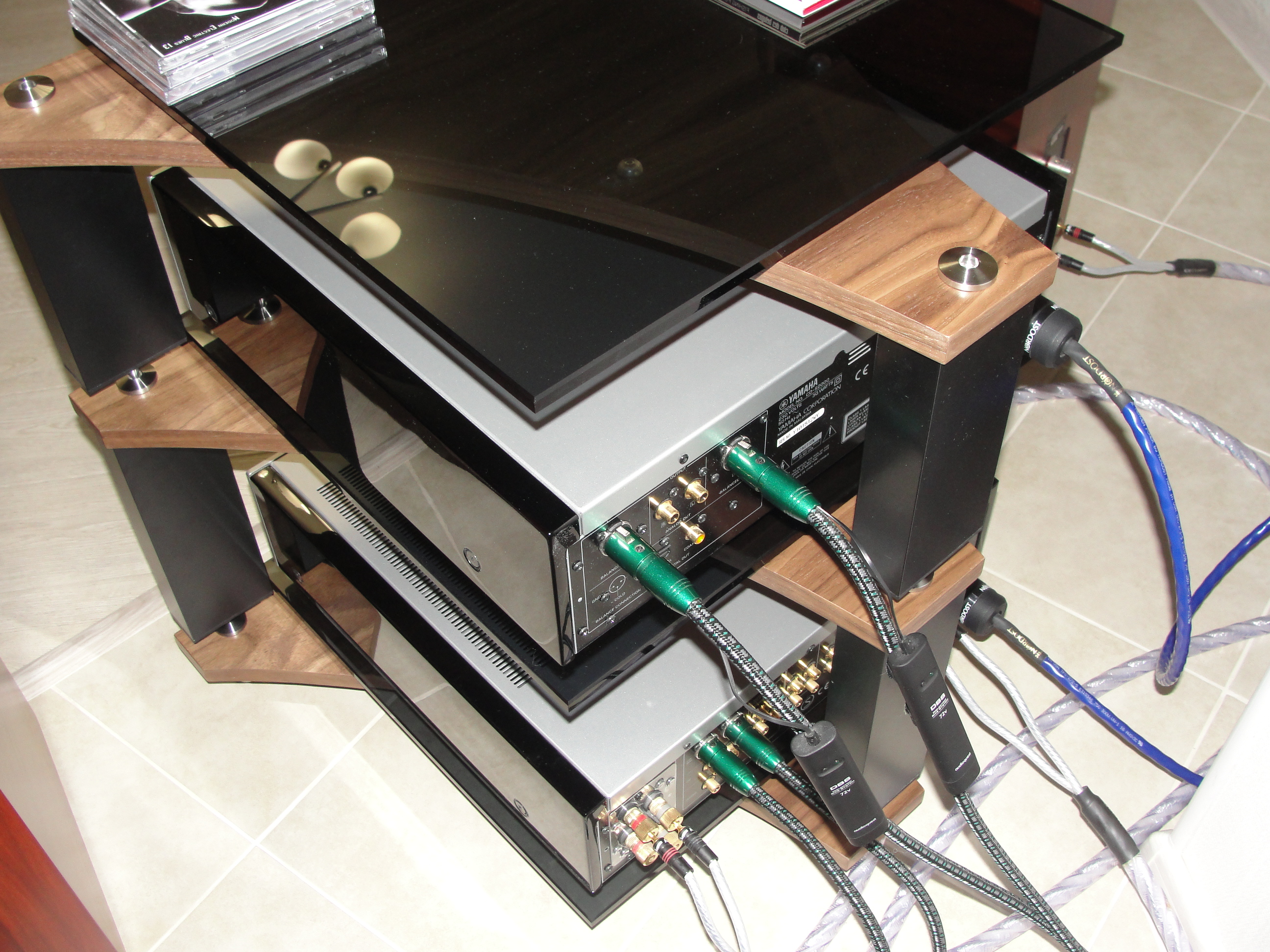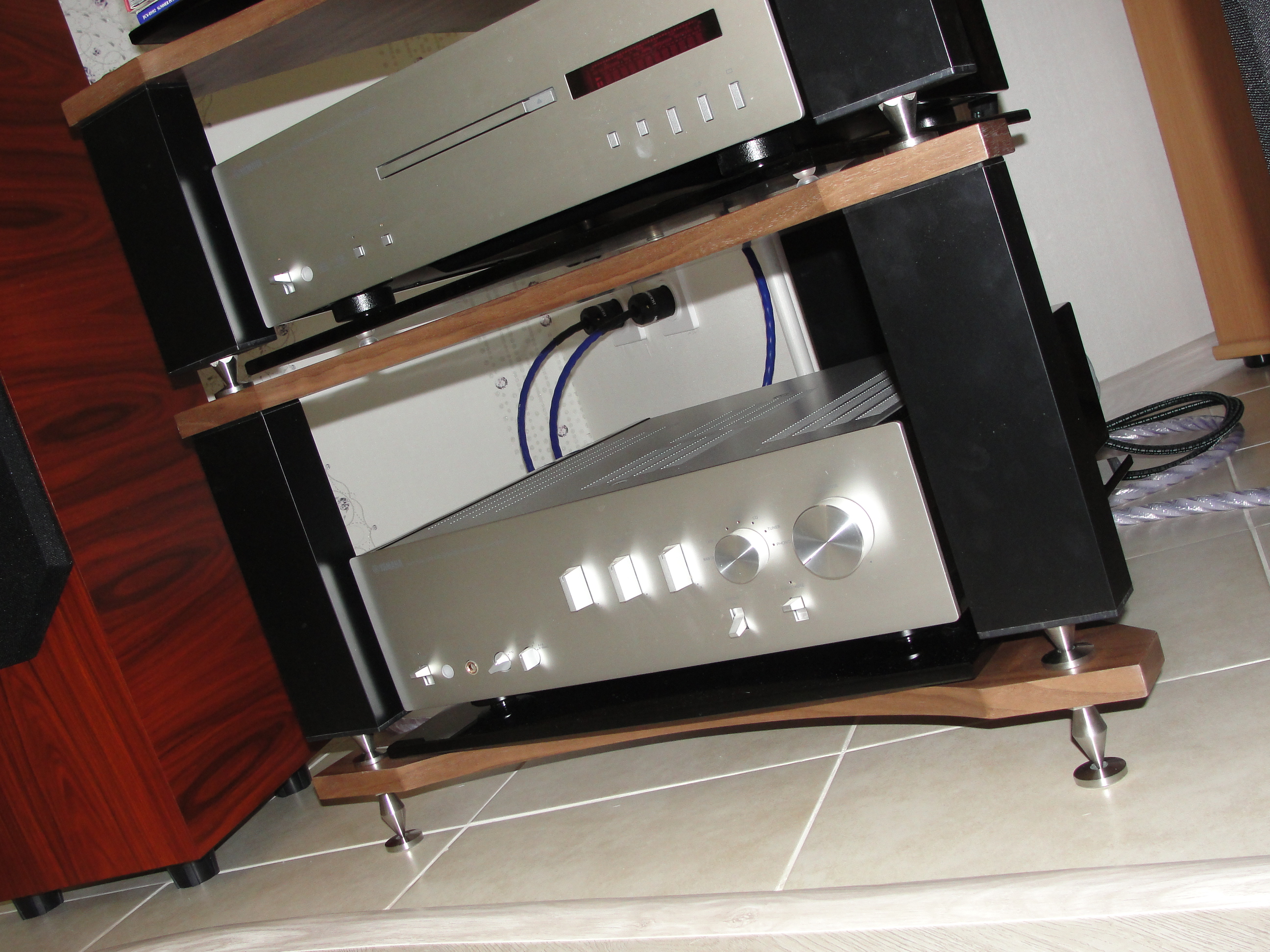 Приобретение комплекта YAMAHA CD и A-S2000 -х поставило меня в тупик - не умещаются по глубине не в одну полку. Так и стояли друг на друге или на ДСП потом на керамограните. Подбором полки в интернете занимался долго. Вес более 22 кг у Ямахи на комплект. А все полочки до 20 кг, как правило, и совсем не глубокие, всё что массово продаётся размер или впритык, или просто не умещается, или Ямаха не развернётся да ещё разъёмы и кабель сзади - хвосты значительные. Всё что соответствует - импортное и с ценами не для моей техники. Нашёл - таки вариант, и полтора года крутился и переписывался с менеджером. Надо отдать должное - не давили на скорую покупку - просто отвечали на вопросы. Полка (стекло) держит нагрузку до 100 кг. Заявленные размеры 540 на 630 мм. Но это внешние размеры всей полки - размер стекла 450 на 450. Я рассчитывал на больший простор, но Ямаха встала точно с небольшими запасами по краям. Толщина полки 20 мм, сначала я подумал о толщине стекла!!! Но толщина стекла 10 мм по факту. Толщина деревянной несущей (не совсем дерево: МДФ, облицованное шпоном) около 20 мм, точно не измерил, но на глазок 18 мм по-моему, не больше