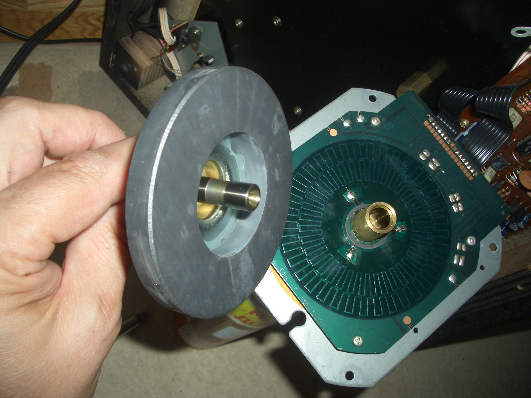 Двигатель отличается от поздних модификаций только в некоторых нюансах. Пластина шасси двигателя крепится к верхней стальной панели через шестигранные шпильки с внутренней резьбой. Эта панель жестко задает ровную плоскость и неизменное расстояние от арма до шпинднля. На поздних стальной панели нет, поэтому шасси мотора крепится к некоей херне в виде буквы П, которая уже крепится к верхней панели. Снизу у поздних модификаций регулируемый по высоте подпятник, а на самом полированном шпинделе нанесена диагональная шабровка для удержания смазки. На ранней версии мотора подпятник глухой, но внизу стоит шарик, а на шпинделе торцевая выточка для него. Смазка жидкая, тогда как на поздних была что то вроде ЦИАТИМа. Короче - основа одна, но разные нюансы. Вот фото из сети мотора поздней модификации: ![]() ![]() ![]() Вот фото мотора KP-700: Удивительно то, что смазка еще есть, а износа почти нет, как и люфта.